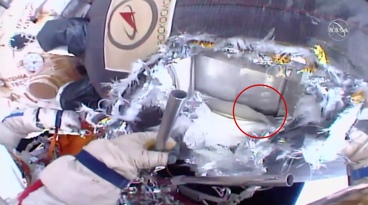 В чем смысл сегодняшнего исследования дыры? Ответ прост. Снаружи корабль «Союз» покрыт экранно-вакуумной теплоизоляцией и слоем микрометеоритной защиты – грубо говоря слоем металла. Отодрав эти слои, космонавты увидят, как выглядит выходное отверстие снаружи корабля.