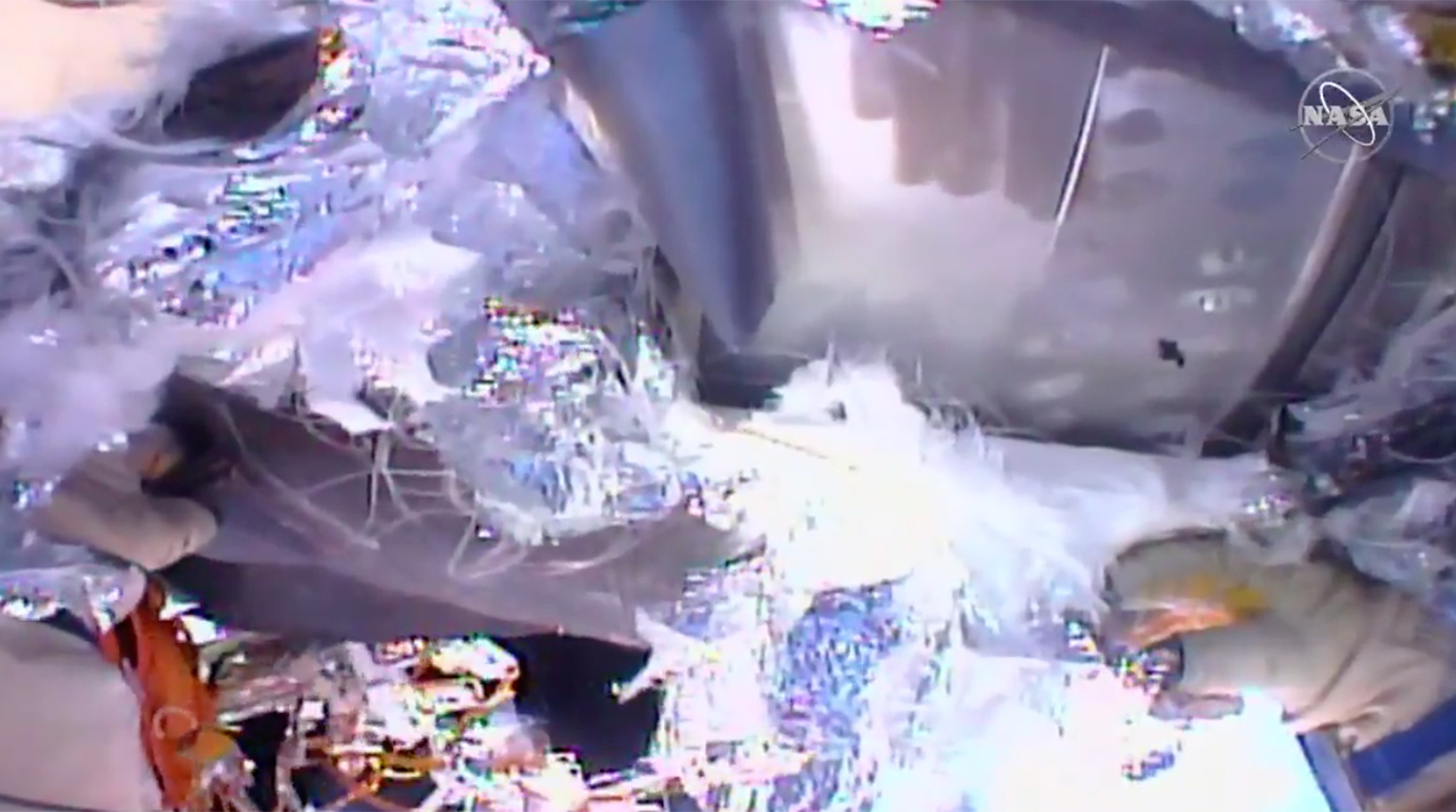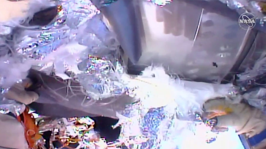 Космонавтам уже удалось снять ширкую площадь изоляции, они говорят, что добрались до металла — то есть до микрометеоритной защиты (ММЗ).
