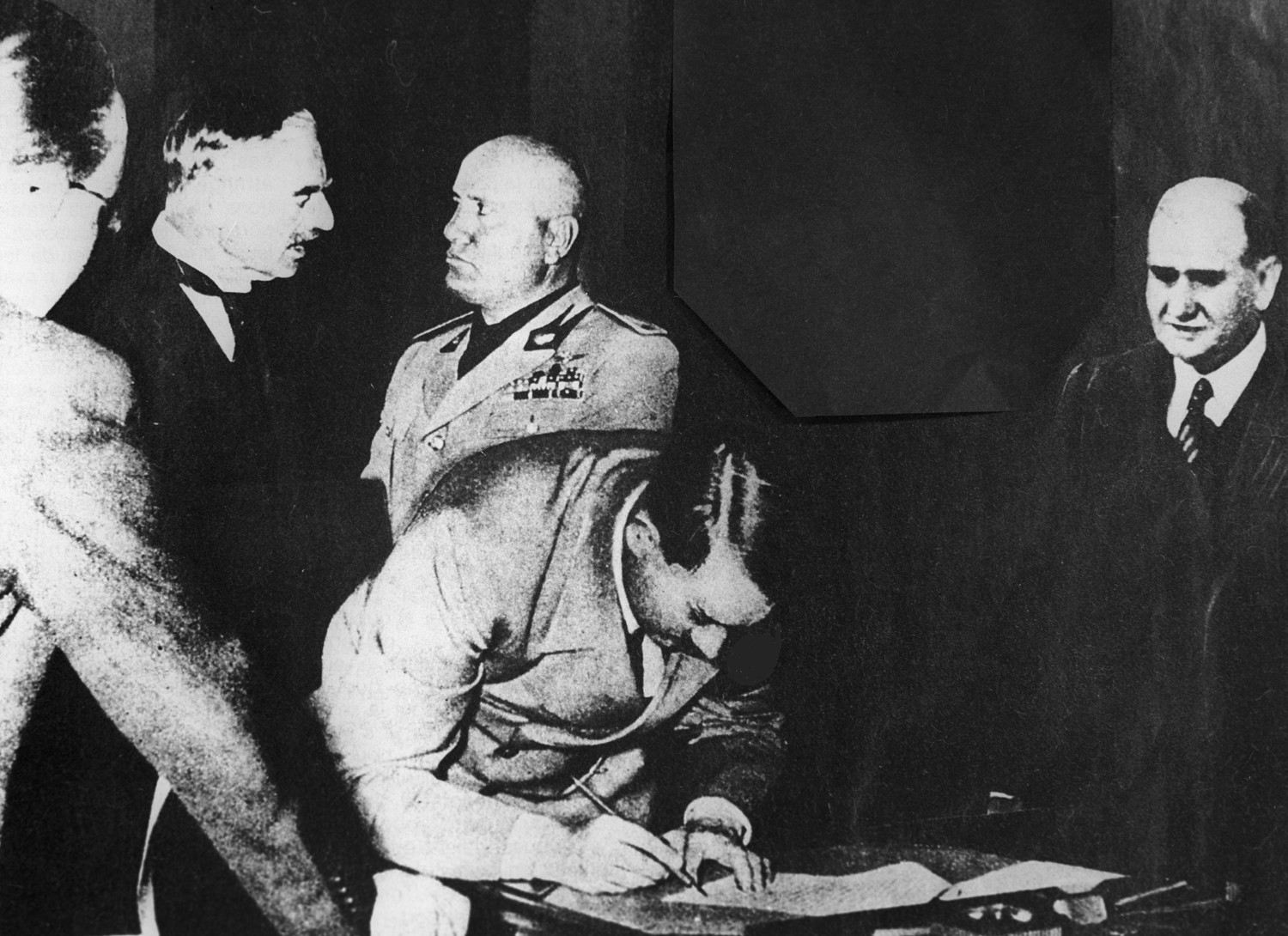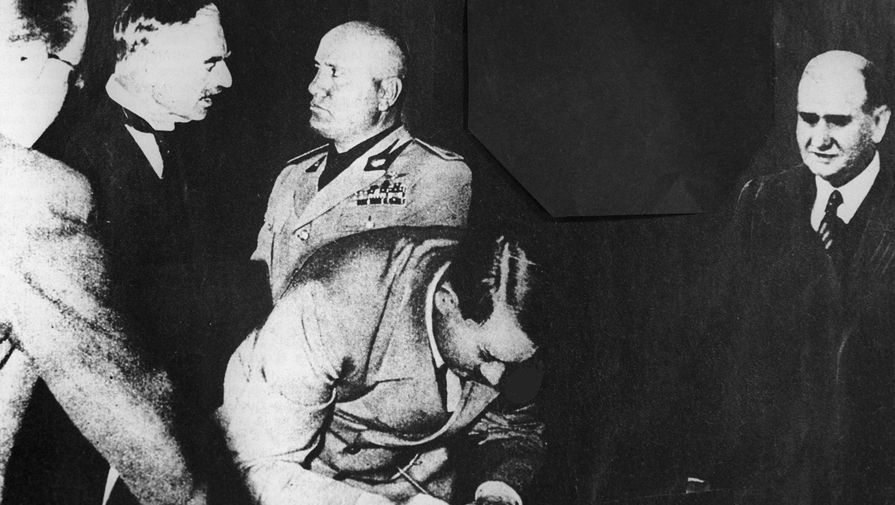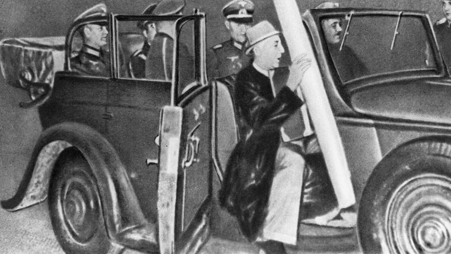 Фюрер Германии Адольф Гитлер (слева) и министр иностранных дел Германии Иоахим фон Риббентроп (в центре), вернувшийся в Берлин после подписания германо-советского договора о ненападении. Госсекретарь МИД Германии Карл Фридрих фон Вайцзеккер (третий справа) в Рейхсканцелярии в Берлине.