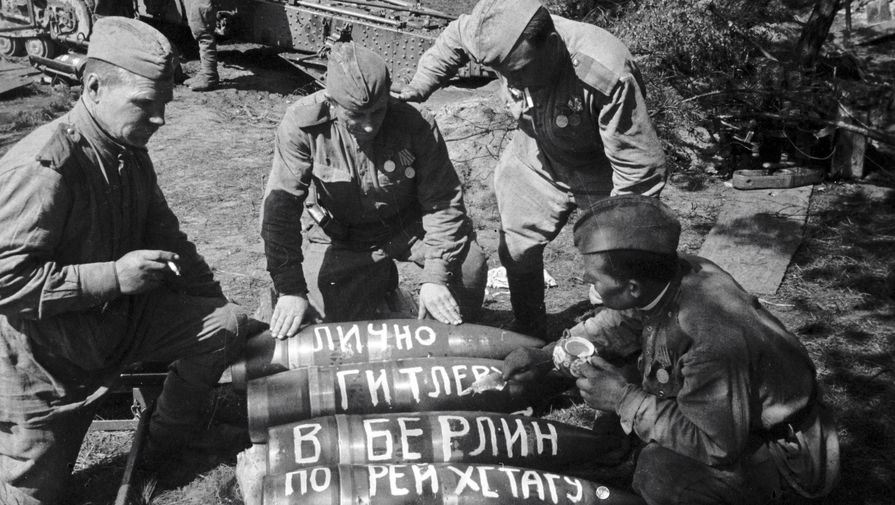 Советские солдаты пишут на снарядах «послания»: «Лично Гитлеру», «В Берлин», «По Рейхстагу».