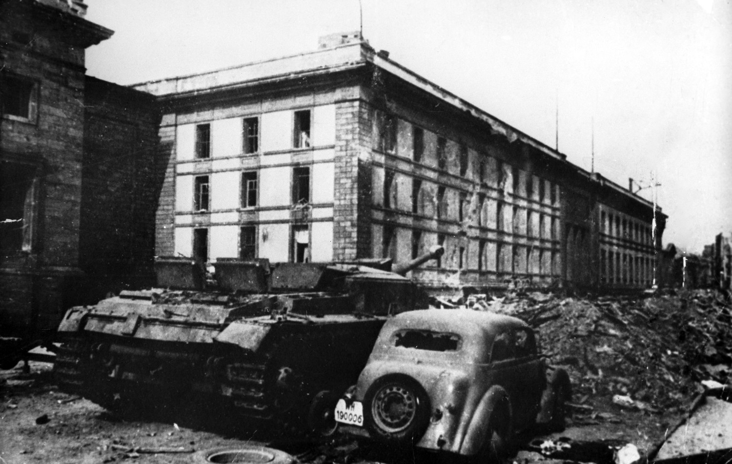 Здание имперской канцелярии в Берлине, под которым находился бункер Гитлера, сохранилось только на архивных снимках. Оно снесено как символ преступлений фашизма.