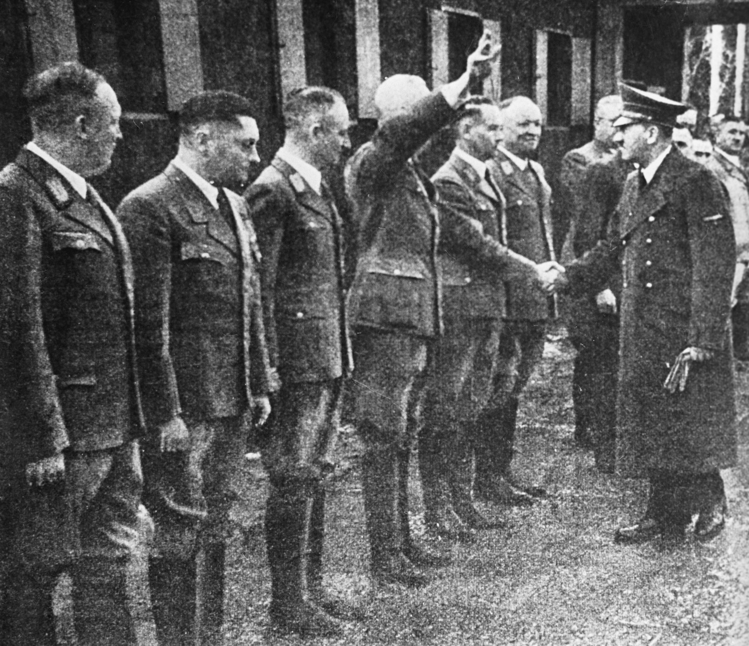 Главный адъютант Гитлера генерал пехоты Рудольф Шмундт (первый слева), фюрер Адольф Гитлер (второй справа)