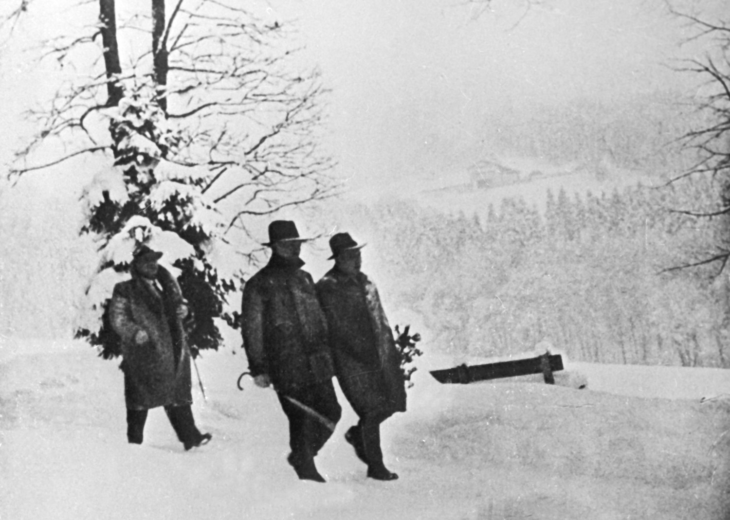 Слева на право: рейхсляйтер Мартин Борман, фюрер Адольф Гитлер, обергруппенфюрер НСКК Эрвин Краус