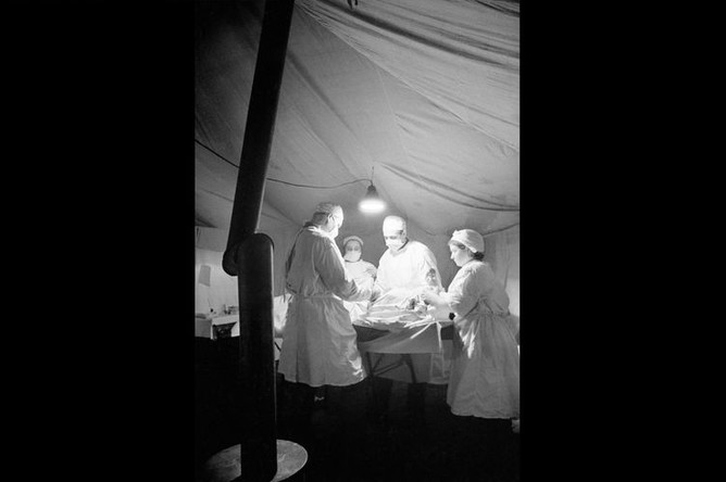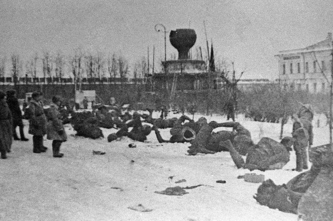 Советские военнослужащие производят первые обследования разрушенного города, где 2,5 года господствовали немцев. Теперь в снегу лежат 15 тыс. трупов вражеских солдат и офицеров. Более 3 тыс. сдались в плен. Суммарно же за период проведения Новгородско-Лужской операции нацисты и их союзники потеряли порядка 82 тыс. человек.