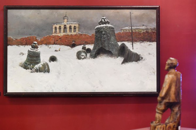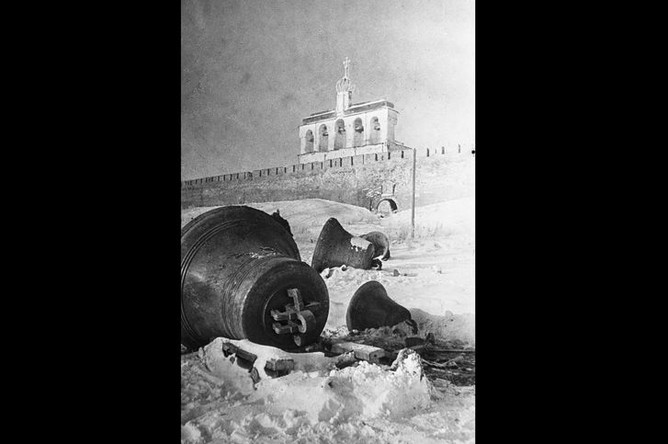 «Страшной силы удар фашистской армии принял на себя Новгород в июле и первой половине августа 1941 года. С приближением линии фронта вражеские бомбардировки усиливались. Вначале они были ежедневными, а затем уже по нескольку раз в сутки завывали радиосирены, тревожные паровозные и пароходные гудки, и голос диктора объявлял: «Воздушная тревога!» С середины июля началась эвакуация населения города вглубь страны, главным образом, в Кировскую область. В первую очередь уезжали дети, женщины и мужчины старших возрастов. Наполненные до предела баржи буксировались по Волхову до станции Кириши, где шла пересадка на железнодорожный транспорт. 14 августа 1941 года фашистское командование бросило на Новгород 70 самолетов. Одна из бомб попала в баржу с колоколами. Реликвии погрузились в воду. 15 августа, накануне вступления фашистов в город, последняя баржа отплыла без буксира. Вниз по течению, отталкиваясь шестами от берегов, ушли новгородцы, спасаясь от фашистского рабства.