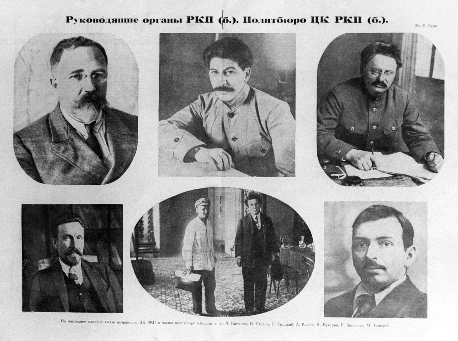 Фотография членов Политбюро ЦК РКБ (б), избранного на Пленуме ЦК РКБ (б) в июне 1924 года. Верхний ряд (слева направо): Лев Каменев, Иосиф Сталин, Лев Троцкий. Нижний ряд (слева направо): Алексей Рыков, Николай Бухарин, Григорий Зиновьев, Михаил Томский.