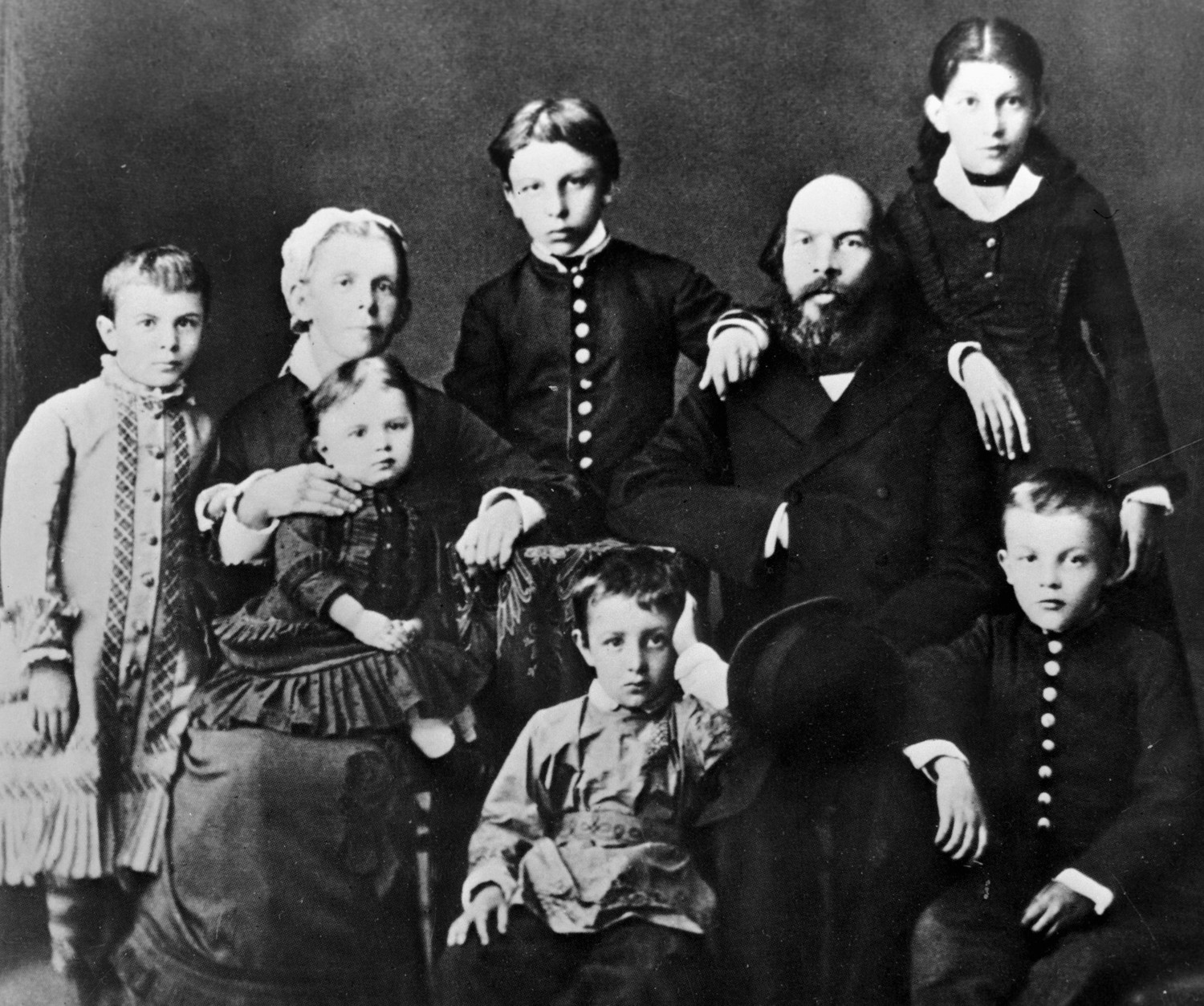 Семья Ульяновых. Стоят: Ольга (1 слева), Александр (2 слева), Анна (3 слева). Сидят: Мария Александровна (1 слева) с младшей дочерью Марией (на коленях), Дмитрий (2 слева), Илья Николаевич (2 справа) и Владимир (1 справа).