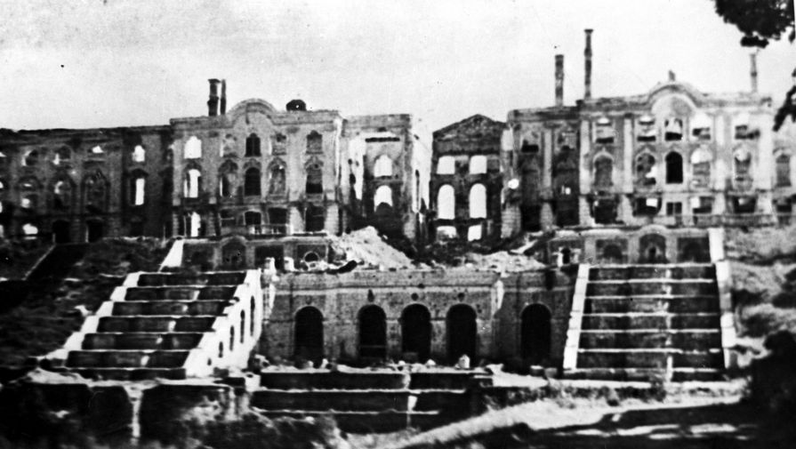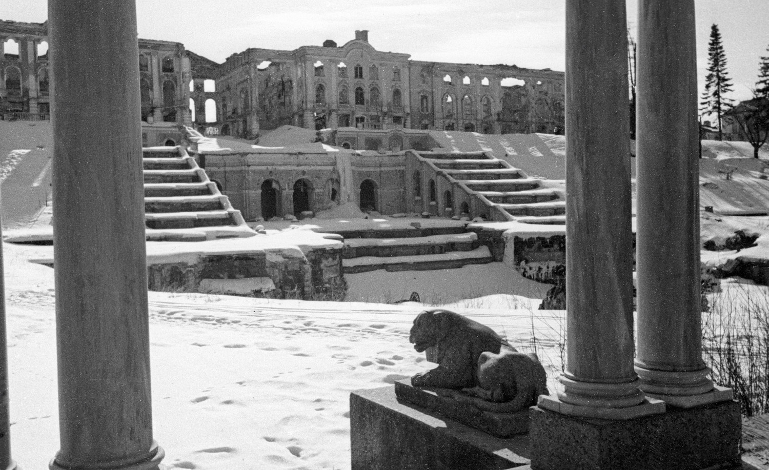 Разрушенный Петродворец в годы Великой Отечественной войны. С 23 сентября 1941 года по 19 января 1944 года город оккупирован германскими войсками. В результате военных действий город был почти полностью разрушен. Около 30 тысяч предметов живописи, декоративно-прикладного искусства и скульптуры из дворцовых коллекций было уничтожено или разграблено; фонтаны и водоводная система выведены из строя; 10 тысяч деревьев — более одной трети зелёного массива — вырублены.