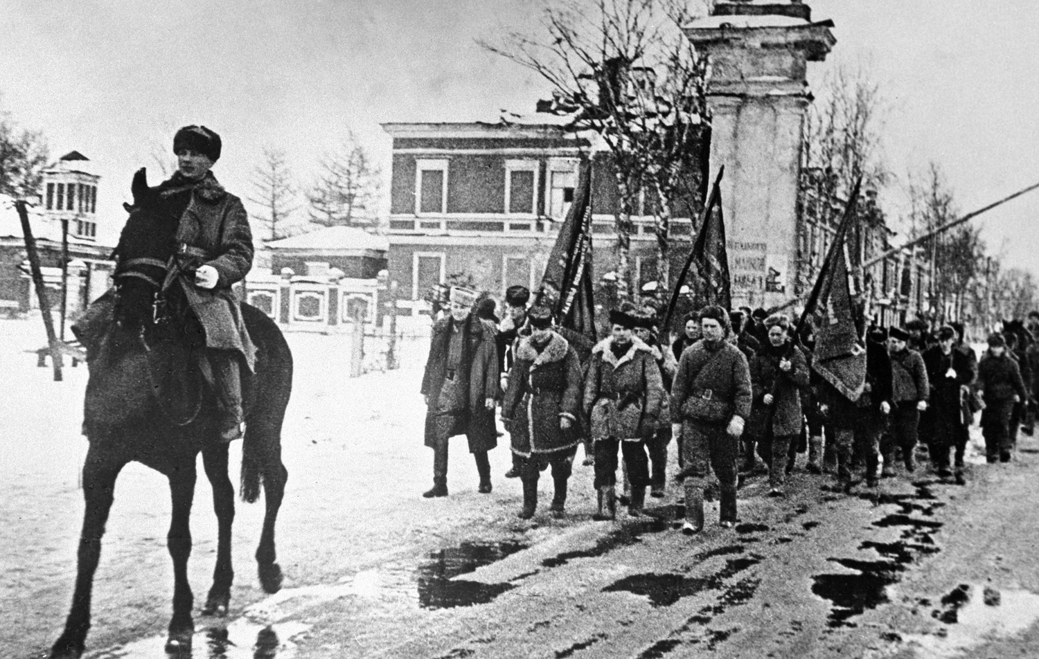 Бойцы Ленинградской партизанской бригады проходят колонной по улицам родного города