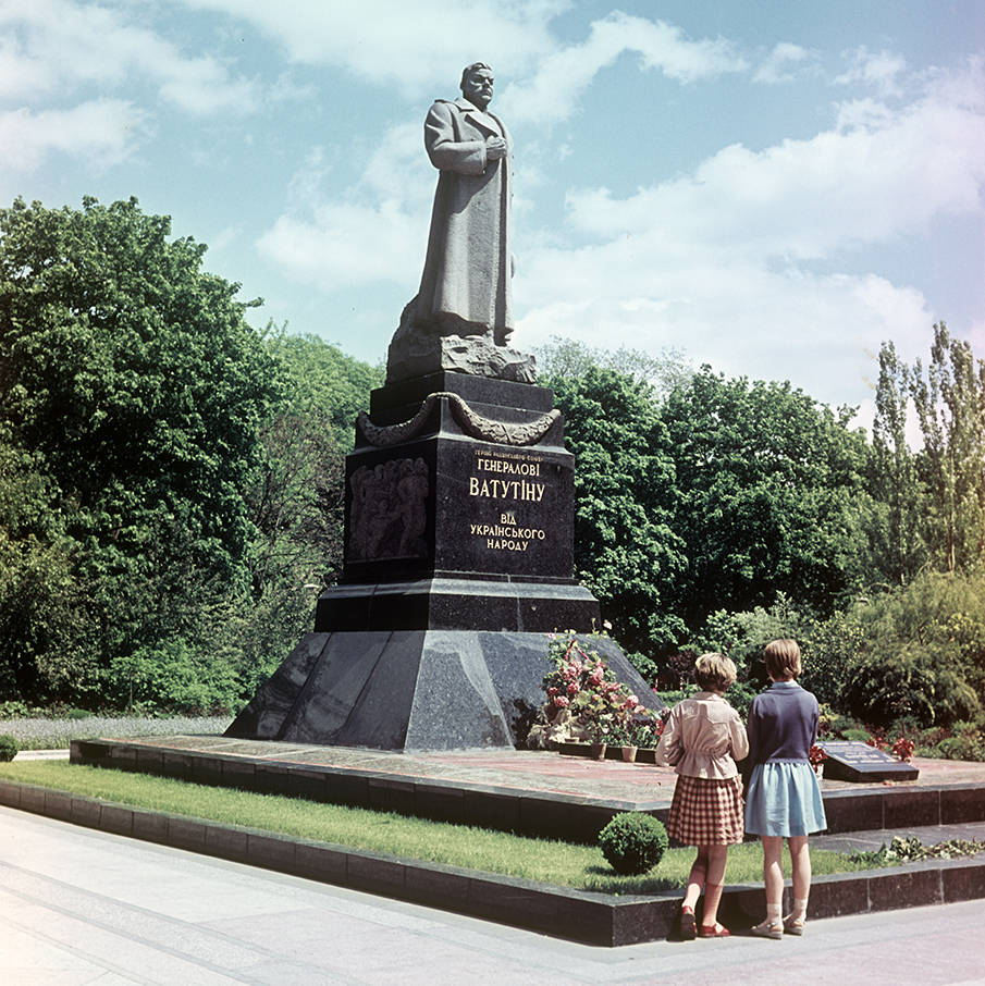 Памятник Герою Советского Союза генералу Н. Ф. Ватутину. Авторы — скульптор Е. Вучетич, архитектор Я. Белопольский, мозаика на пьедестале художника С. Кириченко, барельефы скульптора П. Ульянова, 1965 год