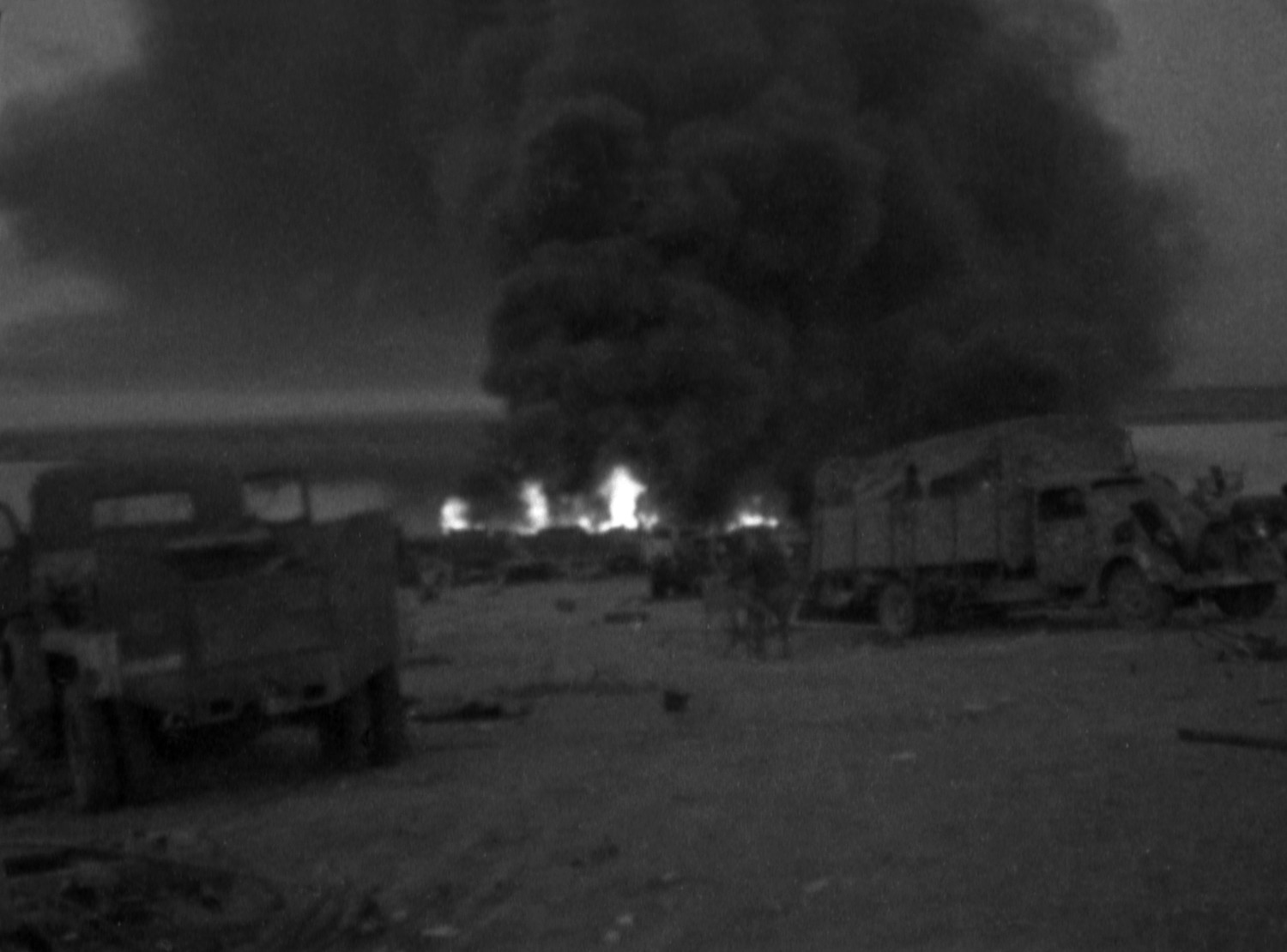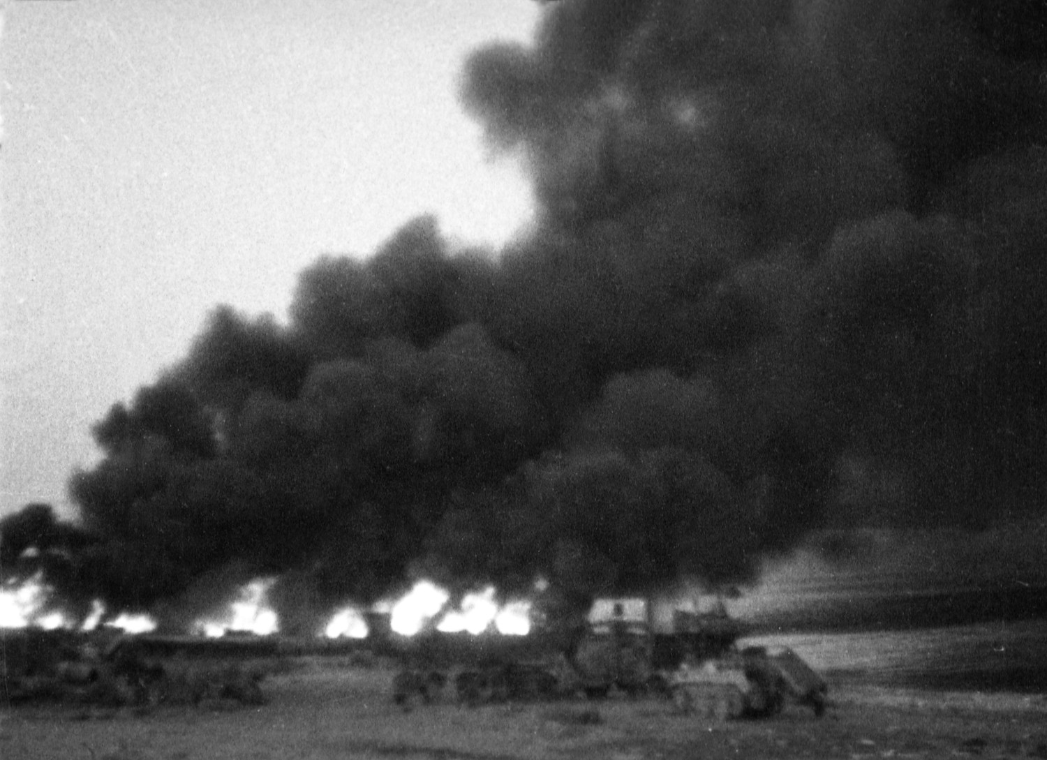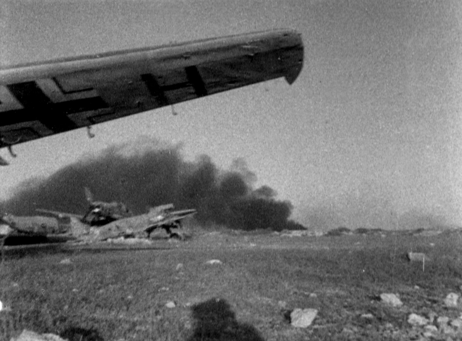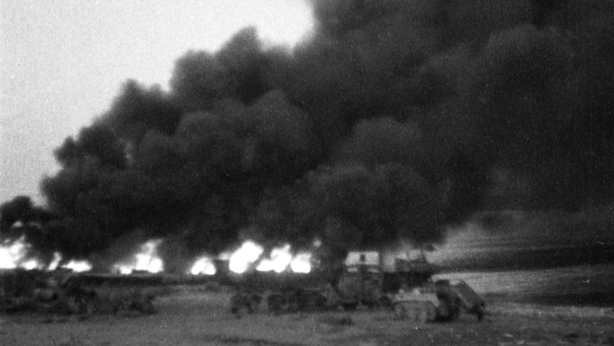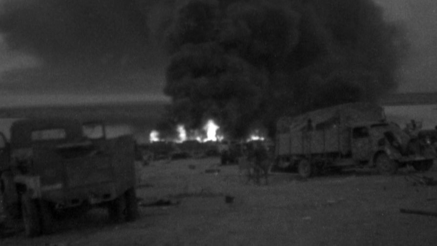 Горящие фашистские самолеты на аэродроме Херсонес во время наступления советских войск на Севастополь. Весна 1944 года.