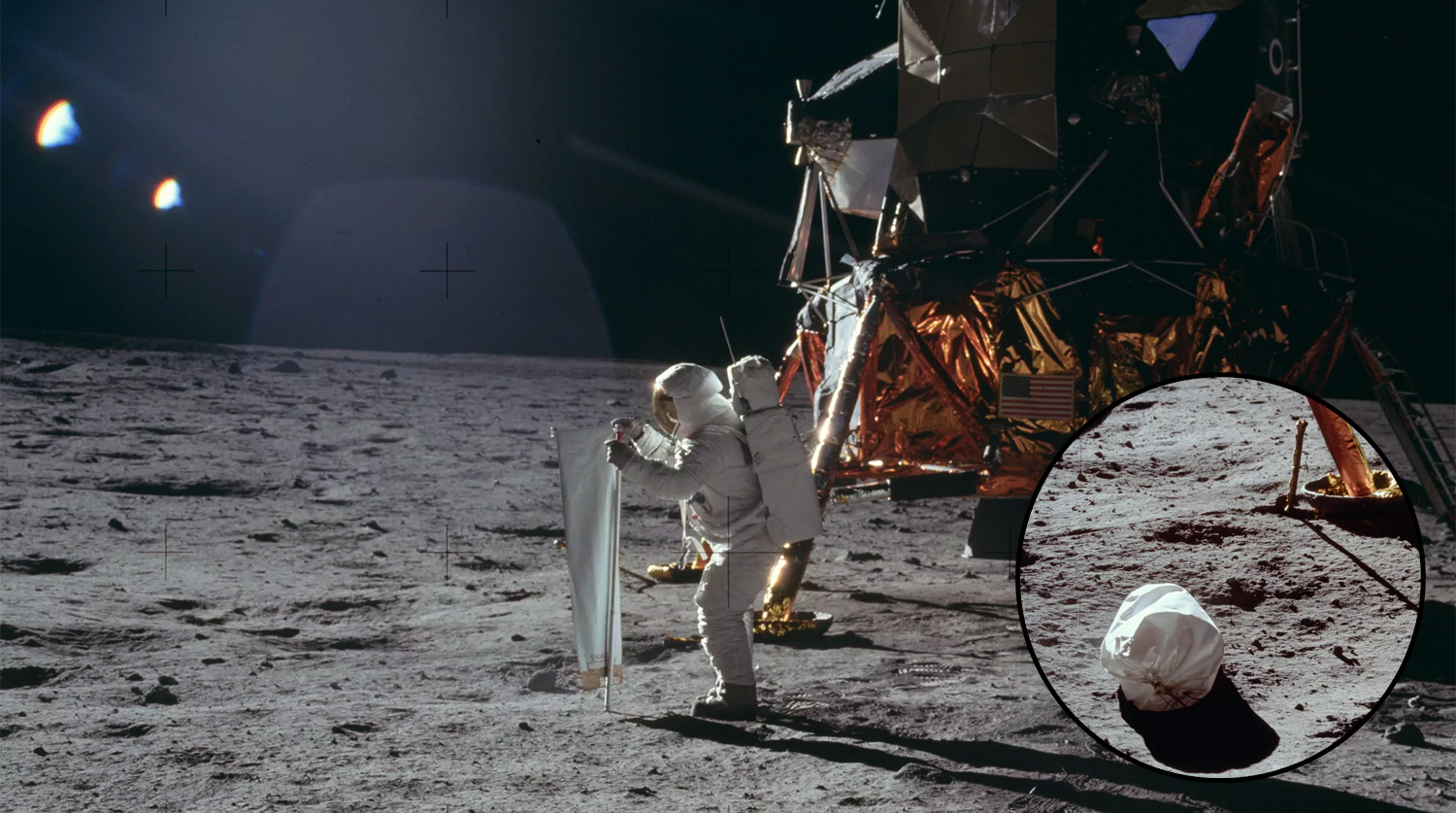 Один из пакетов, в которых могли быть выброшены фекалии, попал на снимок, сделанный Нилом Армстронгом вскоре после высадки на лунную поверхность в 1969 году. Сказать точно, что в нем было, нельзя, однако все остальные пакеты, в том числе с отходами жизнедеятельности, выглядели в точности так.