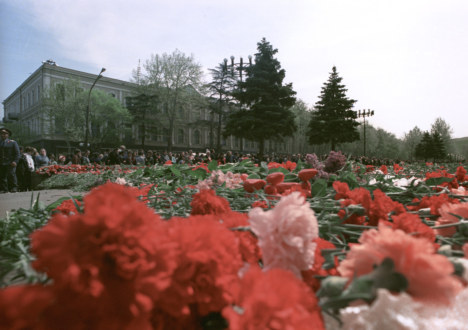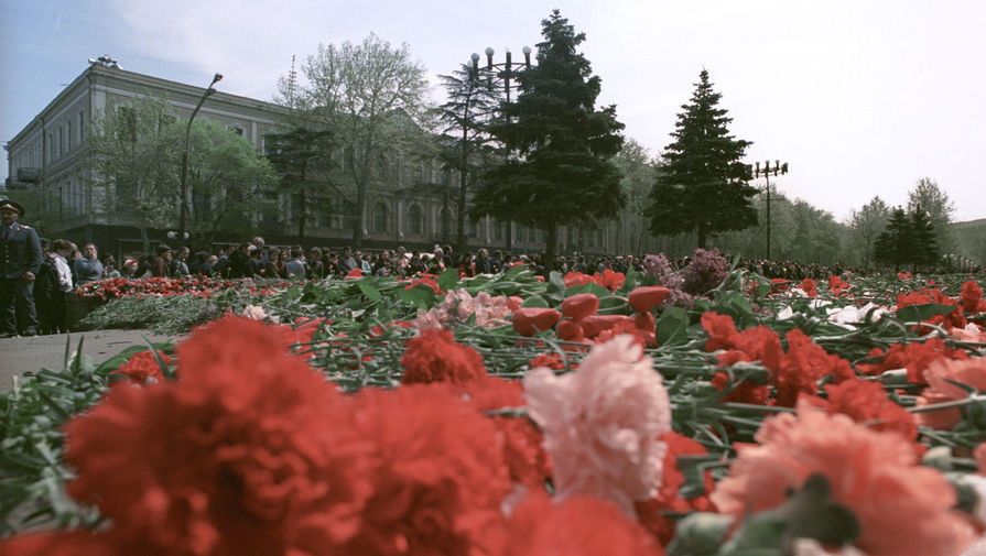 Устланная цветами площадь у Дома правительства в знак скорби по жертвам подавления митинга в Тбилиси 9 апреля 1989 года