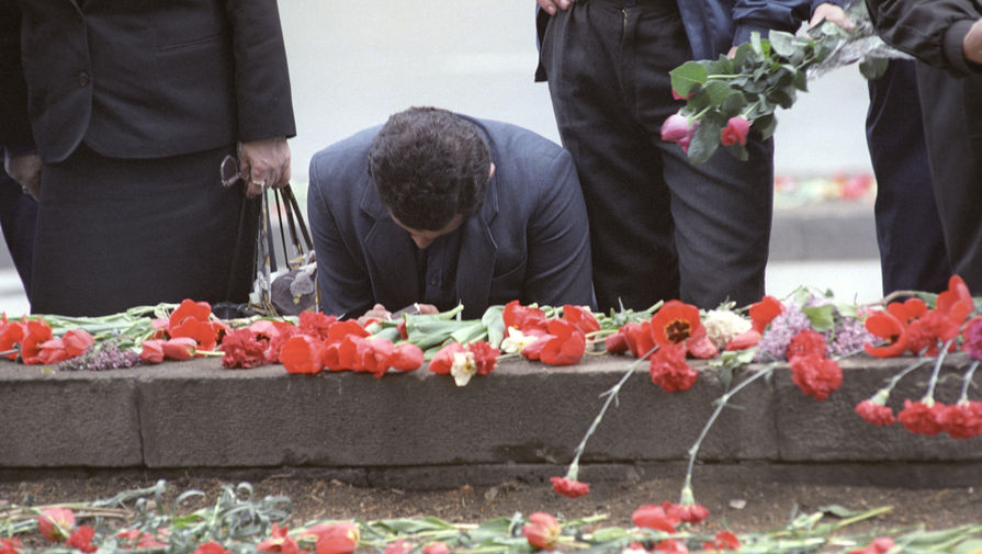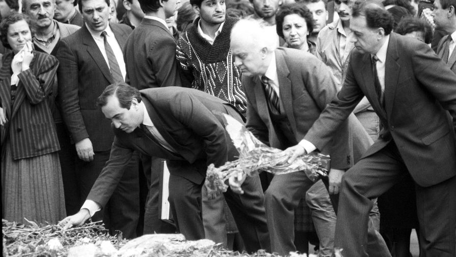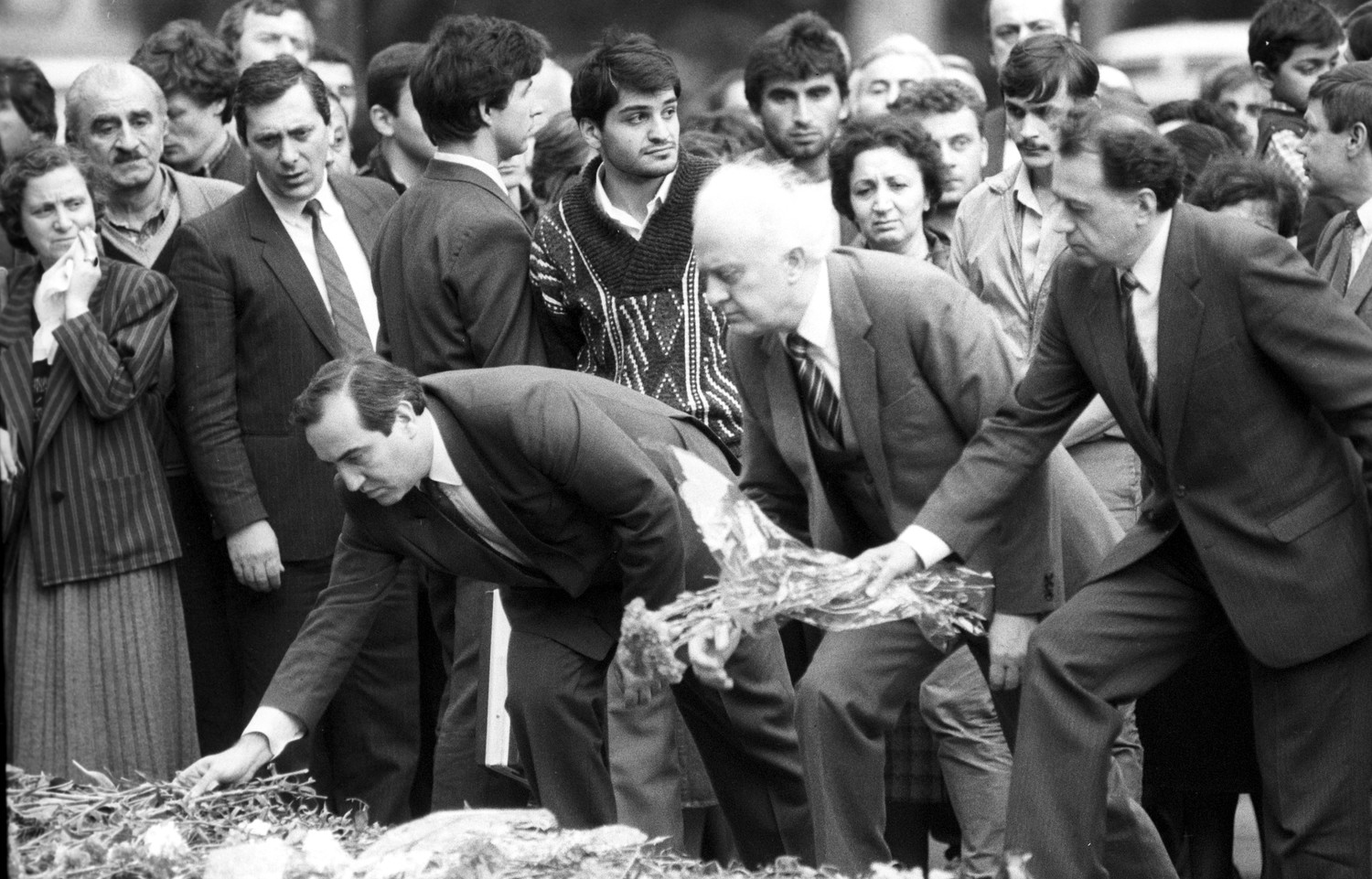 Член Политбюро ЦК КПСС, министр иностранных дел СССР Э.А. Шеварднадзе (в центре), секретарь ЦК КПСС Г.П. Разумовский (справа), 1-й секретарь ЦК КП Грузии Г.Г. Гумбаридзе (слева) возложили цветы на месте трагических событий, у Дома правительства.