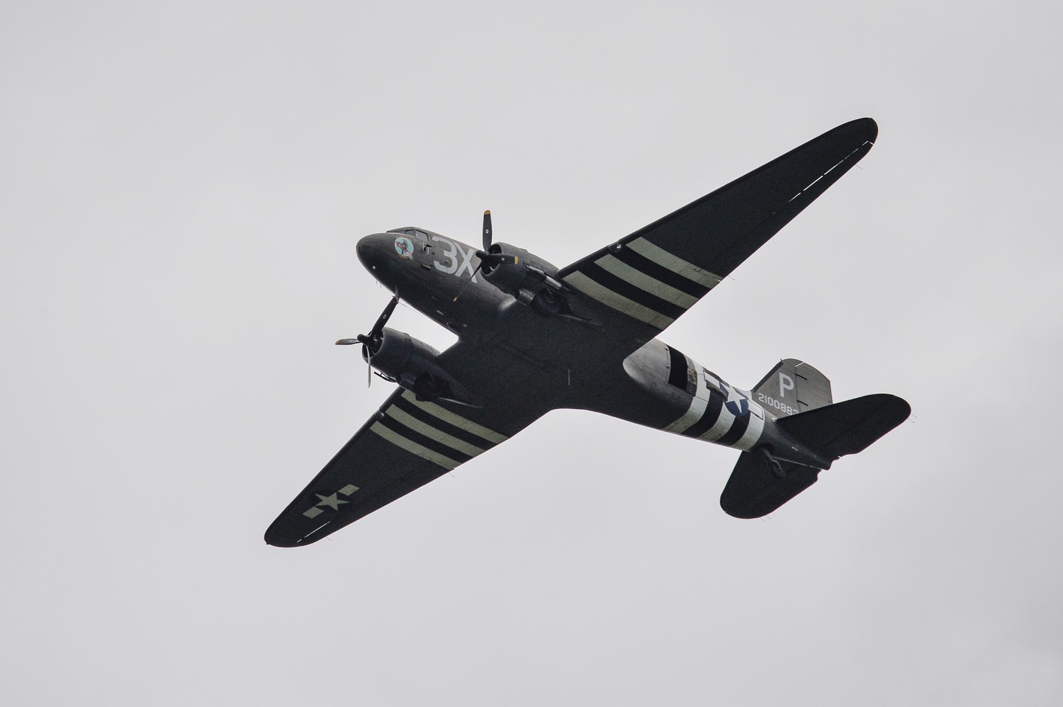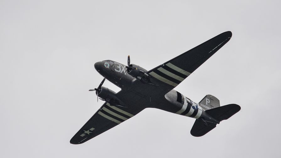 Американский военно-транспортный самолёт Douglas C-47 Skytrain времён Второй мировой войны совершает демонстрационный полет над Американским кладбищем рядом с пляжем «Омаха-Бич» на севере Нормандии (Франция) близ города Лонгвиль в рамках мероприятий по случаю 75-летия высадки союзников во время Второй мировой войны