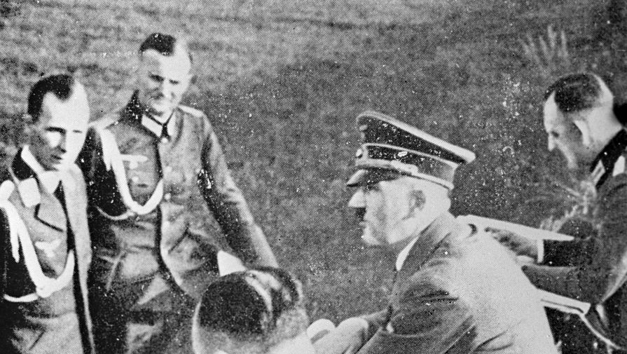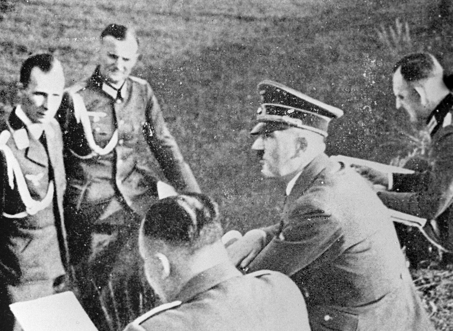 Главный адъютант Гитлера генерал пехоты Рудольф Шмундт (первый слева), фюрер Адольф Гитлер (второй справа)