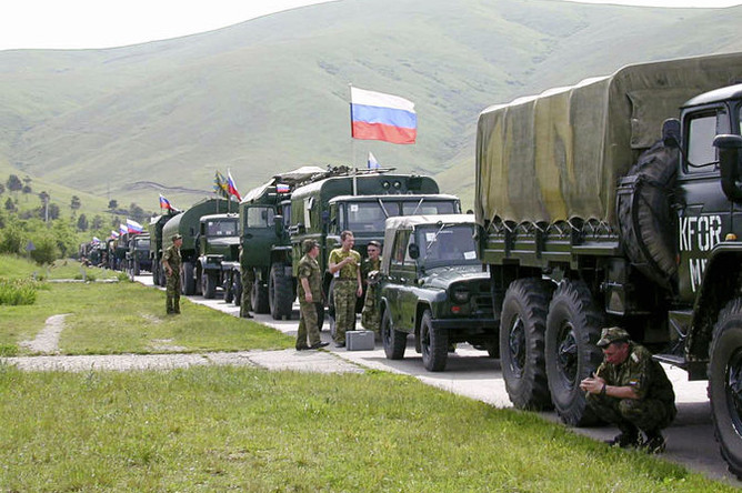 Обе колонны останавливаются перед российскими блокпостами. В небе появляются десантные вертолеты.