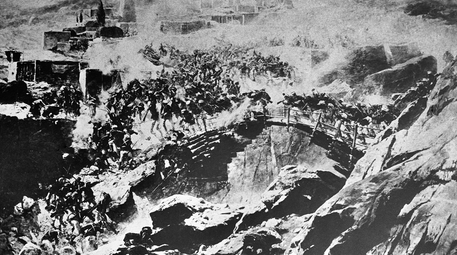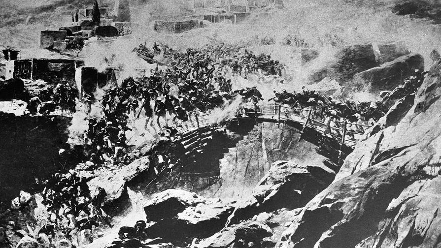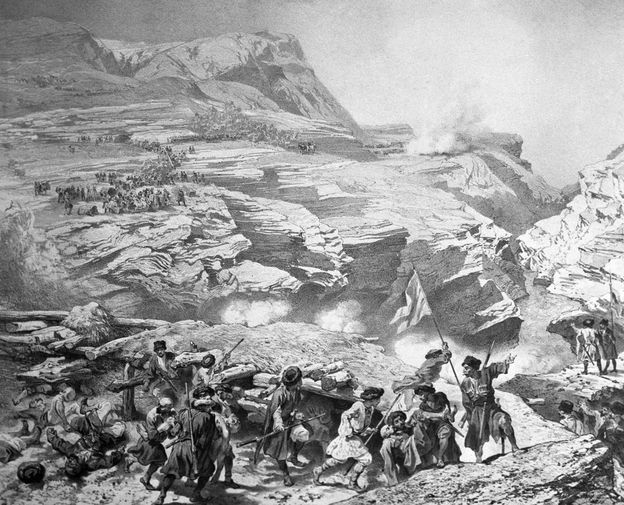 Wikimedia CommonsДействия 1858 года в Чечне начались занятием считавшегося неприступным ущелья реки Аргун, где Евдокимов приказал заложить сильное укрепление, названное Аргунским. Поднимаясь вверх по реке, он достиг, в конце июля, аулов Шатоевского общества. А в верховьях Аргуна заложено им было новое укрепление — Евдокимовское. Шамиль попытался отвлечь внимание диверсией к Назрану, но потерпел поражение от отряда генерала Мищенко и едва успел выйти из боя, не попав в засаду, но избежал этого благодаря успевшему ему на помощь наибу Бета Ачхоевскому, который прорвал кольцо окружения и уйти в незанятую еще часть Аргунского ущелья. Убедившись, что власть его там окончательно подорвана, Шамиль удалился в Ведено — свою новую резиденцию. С 17 марта 1859 года этот аул подвергся артобстрелам, а 1 апреля был взят после штурма. Еще позже, видя грозящую отовсюду опасность, Шамиль ушел на гору Гуниб, где укрепился с 500 мюридами.