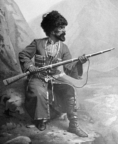 Репродукция литографии, изображающий чеченца с ружьем во время Кавказской войны 1840-50 годов