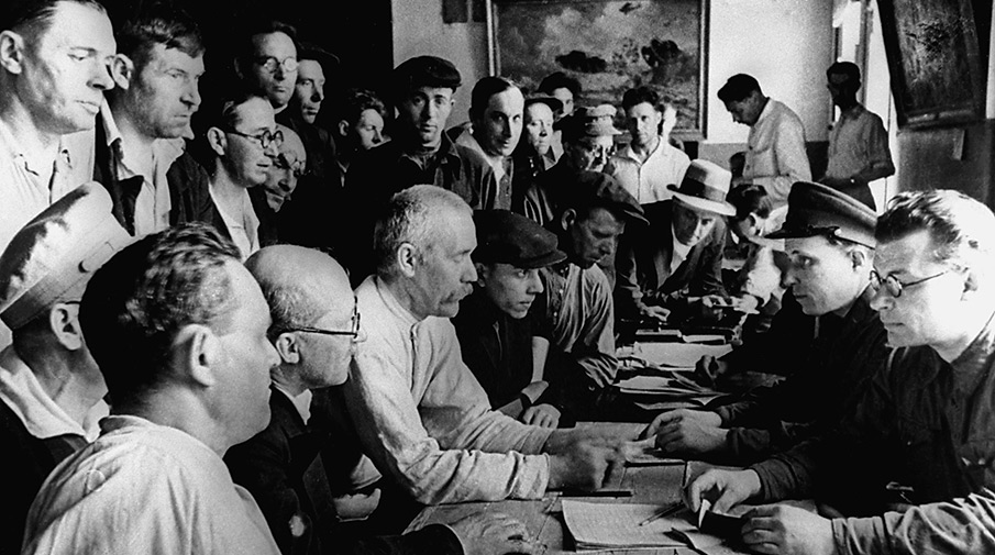 Жители Москвы все как один поднялись на защиту Родины. Из добровольцев было создано несколько ополченческих дивизий. На снимке: москвичи записываются в ряды народного ополчения
