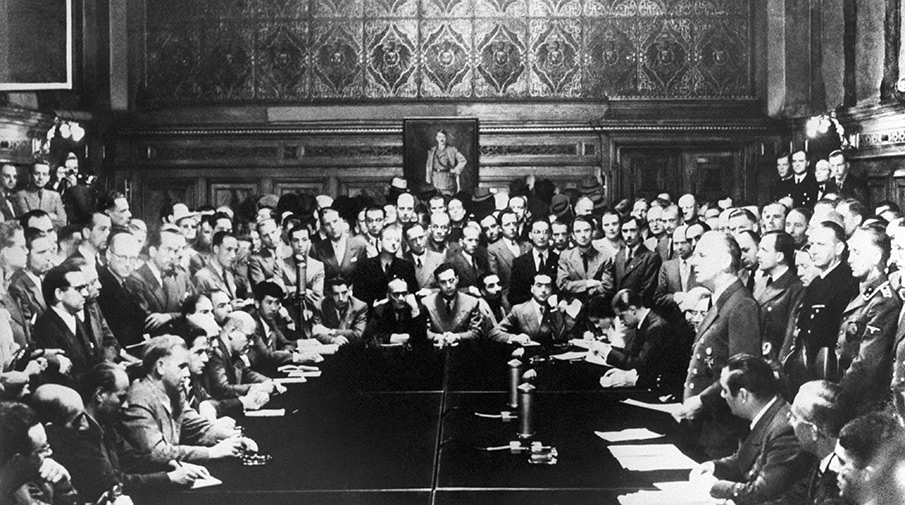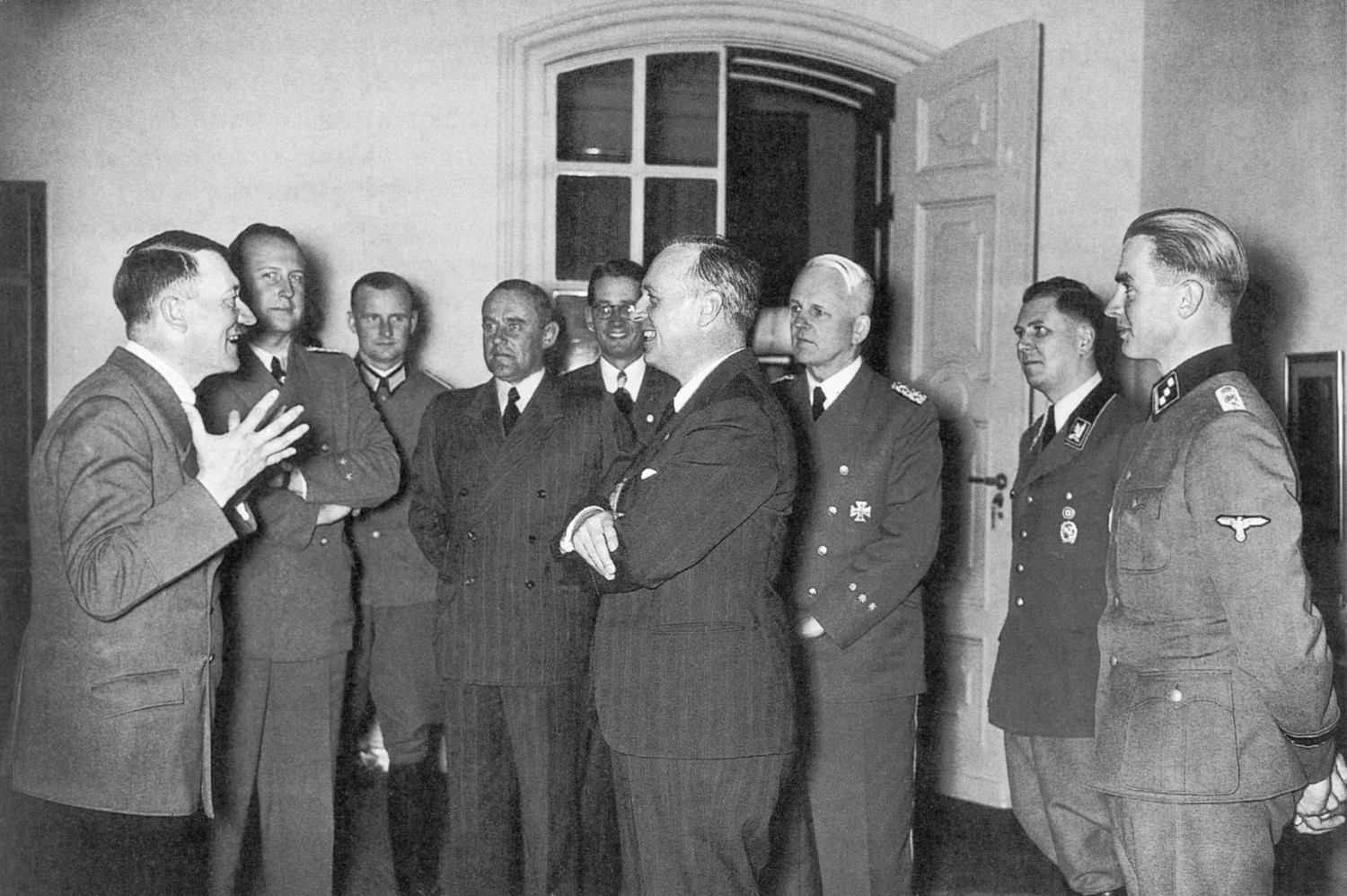 Фюрер Германии Адольф Гитлер (слева) и министр иностранных дел Германии Иоахим фон Риббентроп (в центре), вернувшийся в Берлин после подписания германо-советского договора о ненападении. Госсекретарь МИД Германии Карл Фридрих фон Вайцзеккер (третий справа) в Рейхсканцелярии в Берлине.