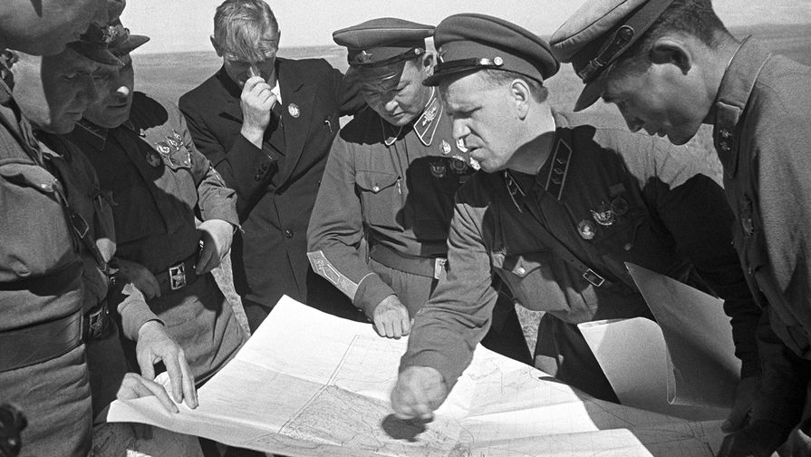 Командующий 1-й армейской группой комкор Георгий Константинович Жуков (2 справа), главком монгольской армии маршал Хорлогийн Чойбалсан (3 справа), посол СССР в Монголии И. А. Иванов (4 справа) и командарм 2-го ранга генерал-полковник Григорий Михайлович Штерн (3 слева) во время обсуждения предстоящей операции во время боев на Халхин-Голе, 1939 год