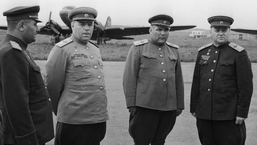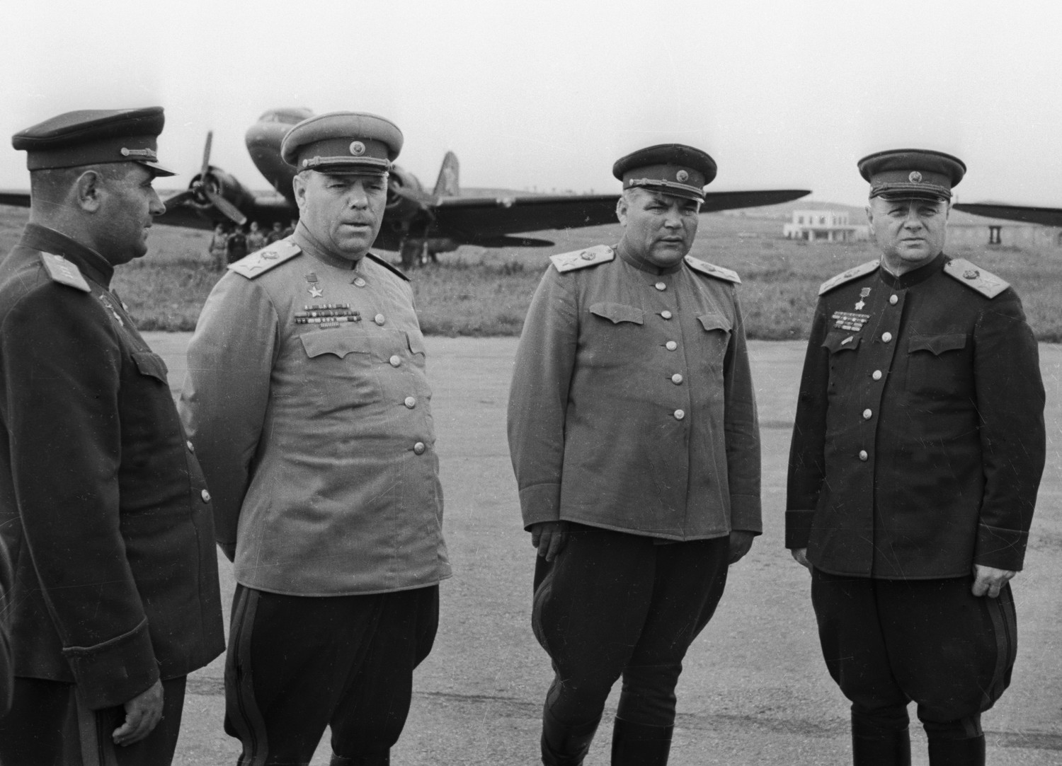Маршалы Советского Союза Родион Малиновский, Александр Василевский и Кирилл Мерецков (справа налево) на аэродроме
