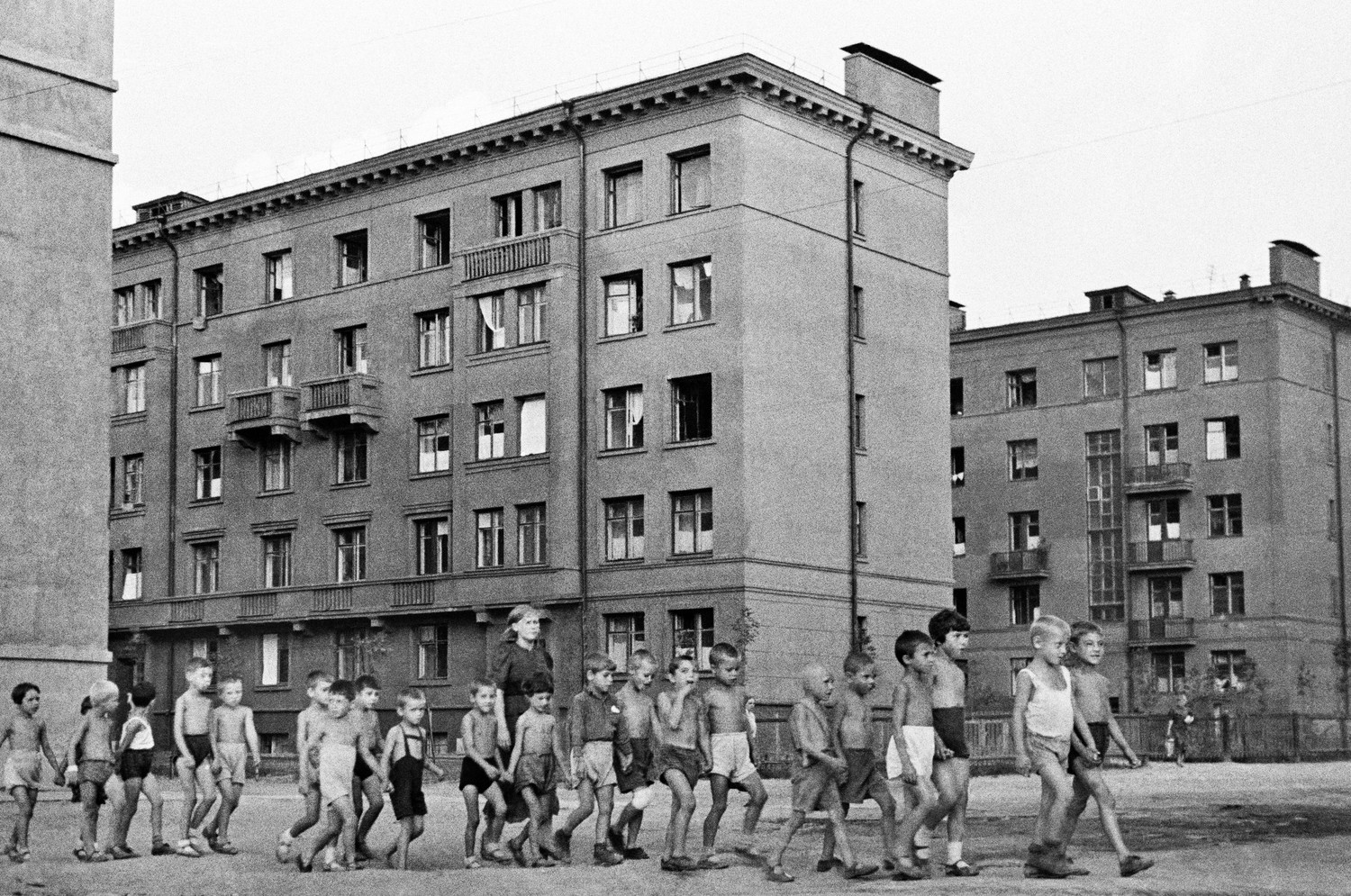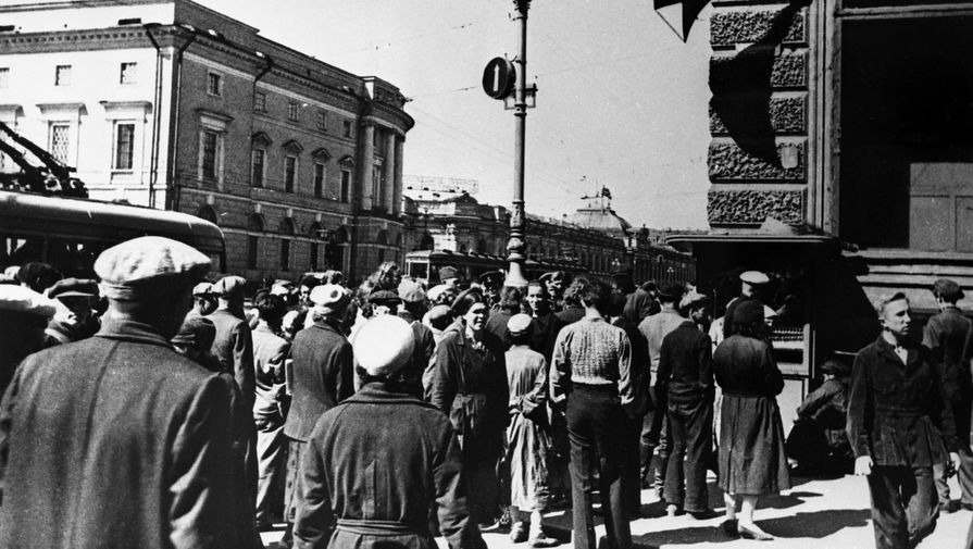 Невский проспект. Жители Ленинграда 22 июня 1941 года во время объявления по радио правительственного сообщения о нападении фашистской Германии на Советский Союз.