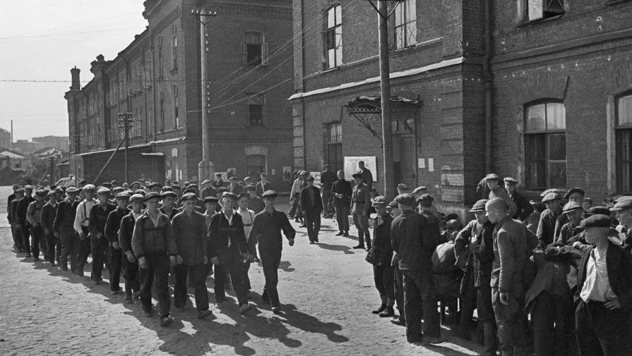 Рабочие Кировского завода направляются на фронт. Ленинград, 1941 год