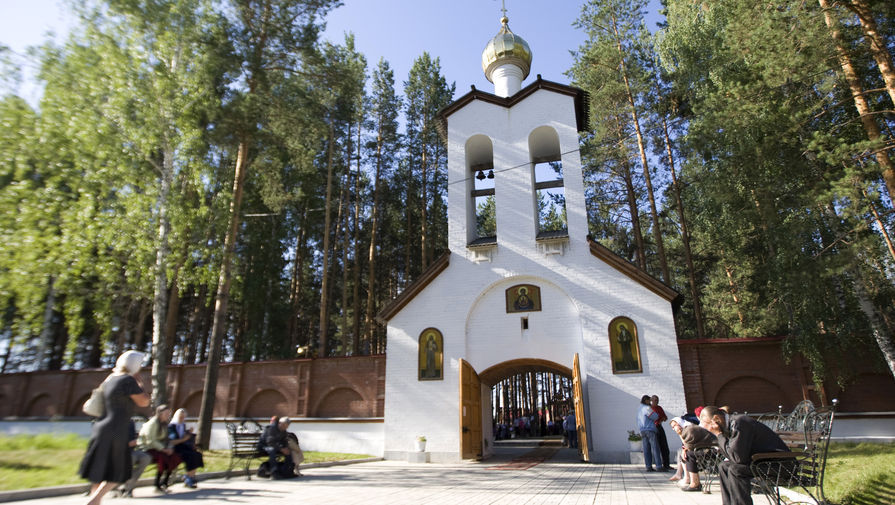 Паломники у Поклонного креста на краю мемориальной шахты в Алапаевском мужском монастыре Новомученников Российских, построенном на месте гибели великой княгини Елизаветы Федоровны