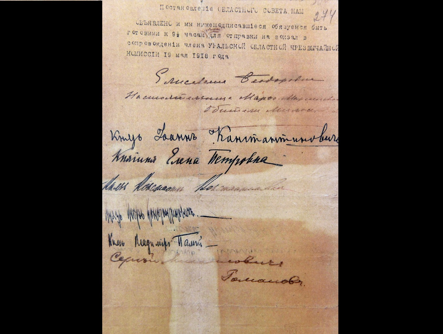 Расписка о готовности следовать в Алапаевск великой княгини Елизаветы Федоровны, великого князя Сергея Михайловича, князей Иоанна, Константина и Игоря Константиновичей, княгини Елены Петровны, князя Владимира Палея от мая 1918 года в музее святой царской семьи в Екатеринбурге.
