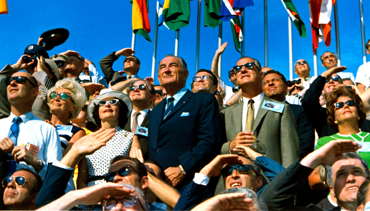 Экс-президент США Линдон Джонсон и вице-президент Спиро Агню во время запуска ракеты «Сатурн-5» с пилотируемым кораблем «Аполлон-11» с территории космического центра Кеннеди во Флориде, 16 июля 1969 года