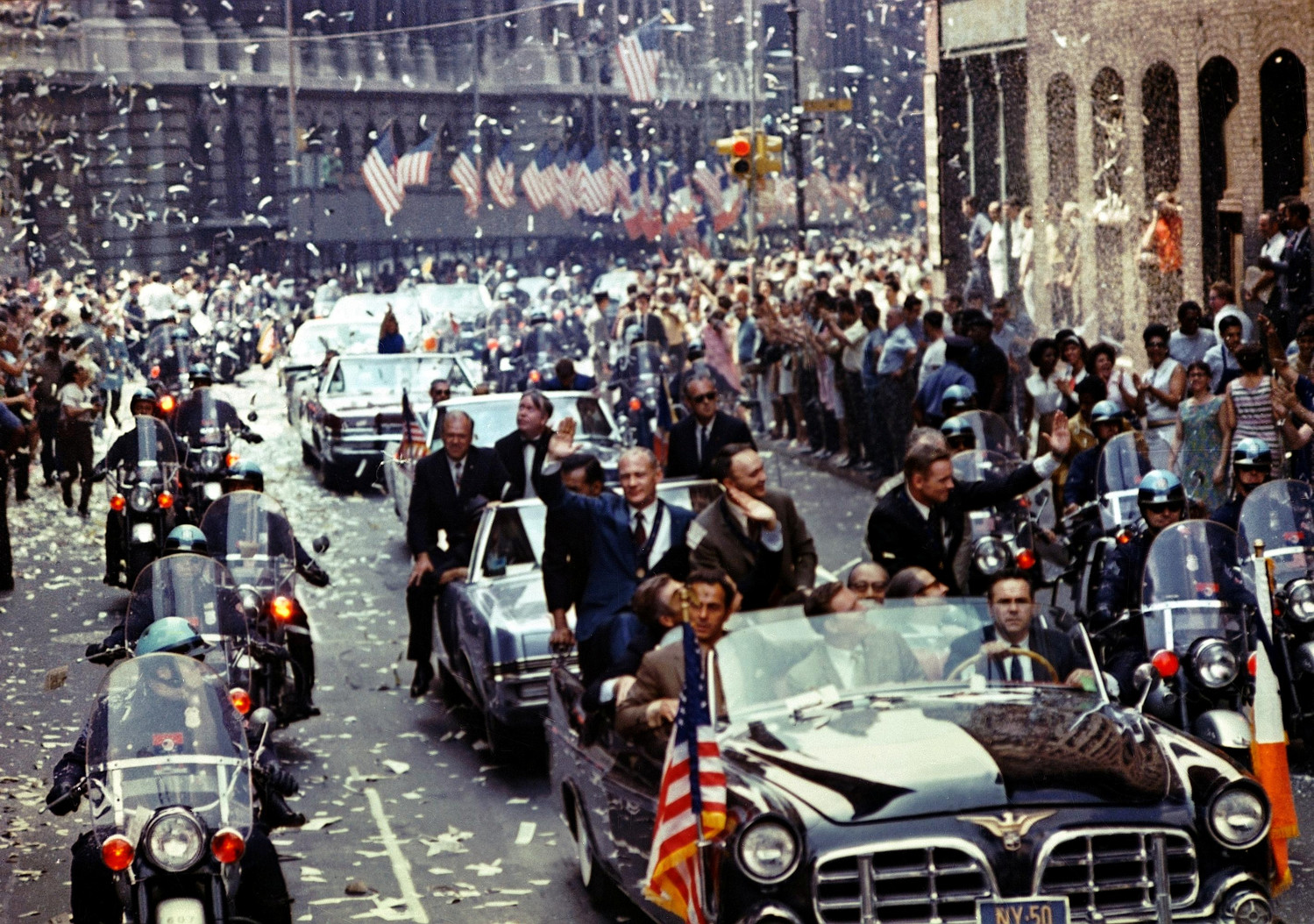 Нил Армстронг, Майкл Коллинз, Эдвин Олдрин во время праздничного парада в Нью-Йорке после успешной миссии, 13 августа 1969 года