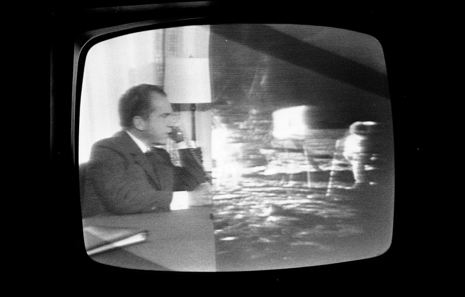 Экран телевизора с президентом США Ричардом Никсоном в Овальном кабинете Белого дома и астронавтами Баззом Олдрином и Нилом Армстронгом на поверхности Луны, 20 июля 1969 года