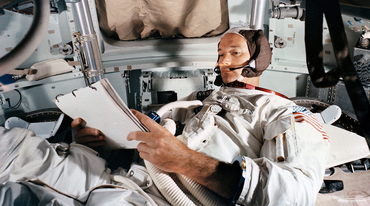 Пилот командного модуля Майкл Коллинз во время тренировки перед запуском ракеты «Сатурн-5» с пилотируемым кораблем «Аполлон-11» с территории космического центра Кеннеди во Флориде, июнь 1969 года