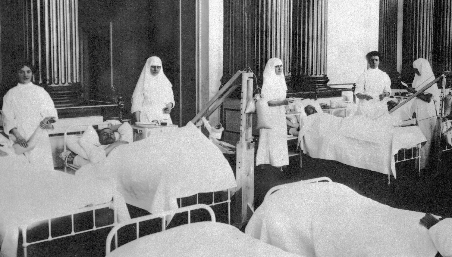 Медицинские сестры у постелей раненых в лазарете в императорском Зимнем дворце во время Первой мировой войны.