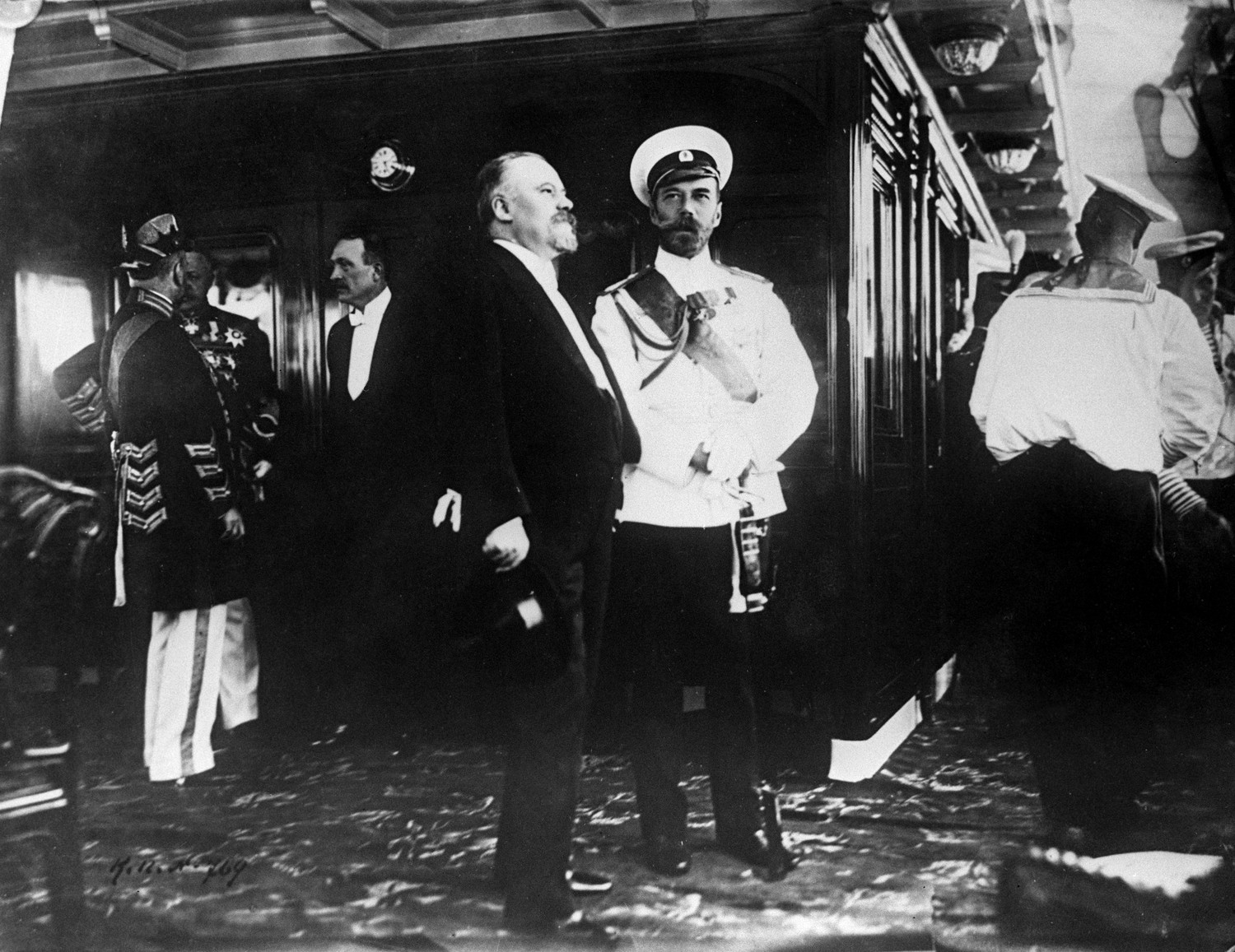 Официальный визит президента Франции Пуанкаре в Россию.Император России Николай II (второй справа), президент Французской республики Раймон Пуанкаре (третий справа) и сопровождающие их лица на борту императорской яхты «Александрия». Июль 1914 года.