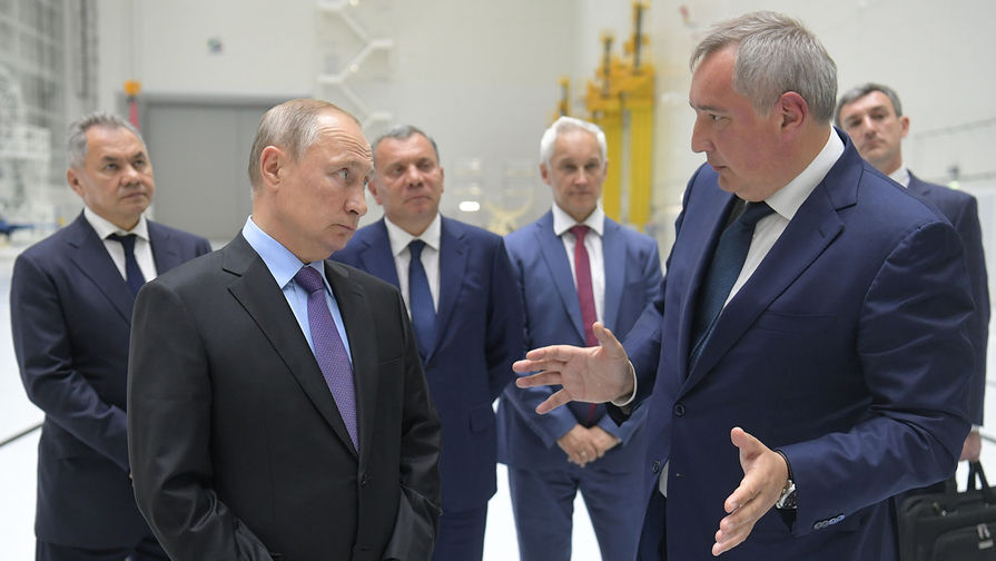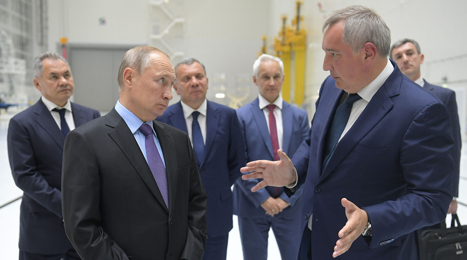 Президент России Владимир Путин во время посещения космодрома Восточный. Справа: генеральный директор Государственной корпорации по космической деятельности «Роскосмос» Дмитрий Рогозин, 6 сентября 2019 года
