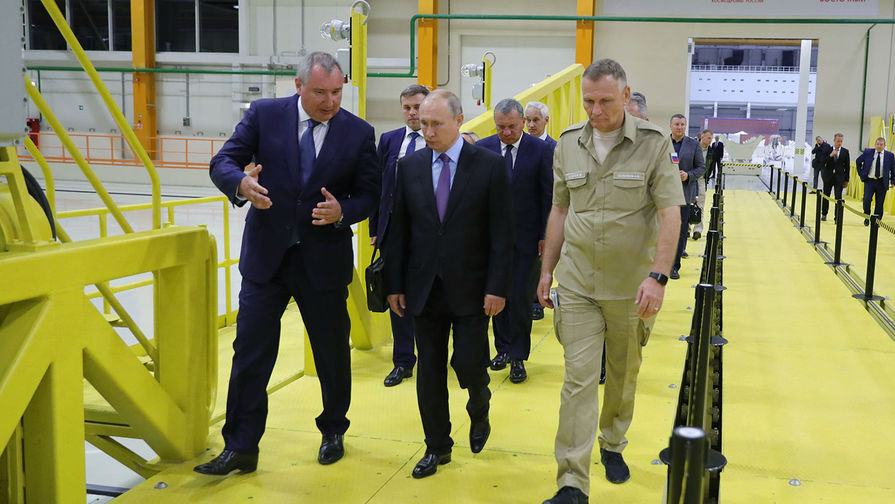 Президент России Владимир Путин во время посещения космодрома Восточный. Слева: генеральный директор Государственной корпорации по космической деятельности «Роскосмос» Дмитрий Рогозин. Справа: генеральный директор Центра эксплуатации объектов наземной космической инфраструктуры (ЦЭНКИ) Андрей Охлопков, 6 сентября 2019 года