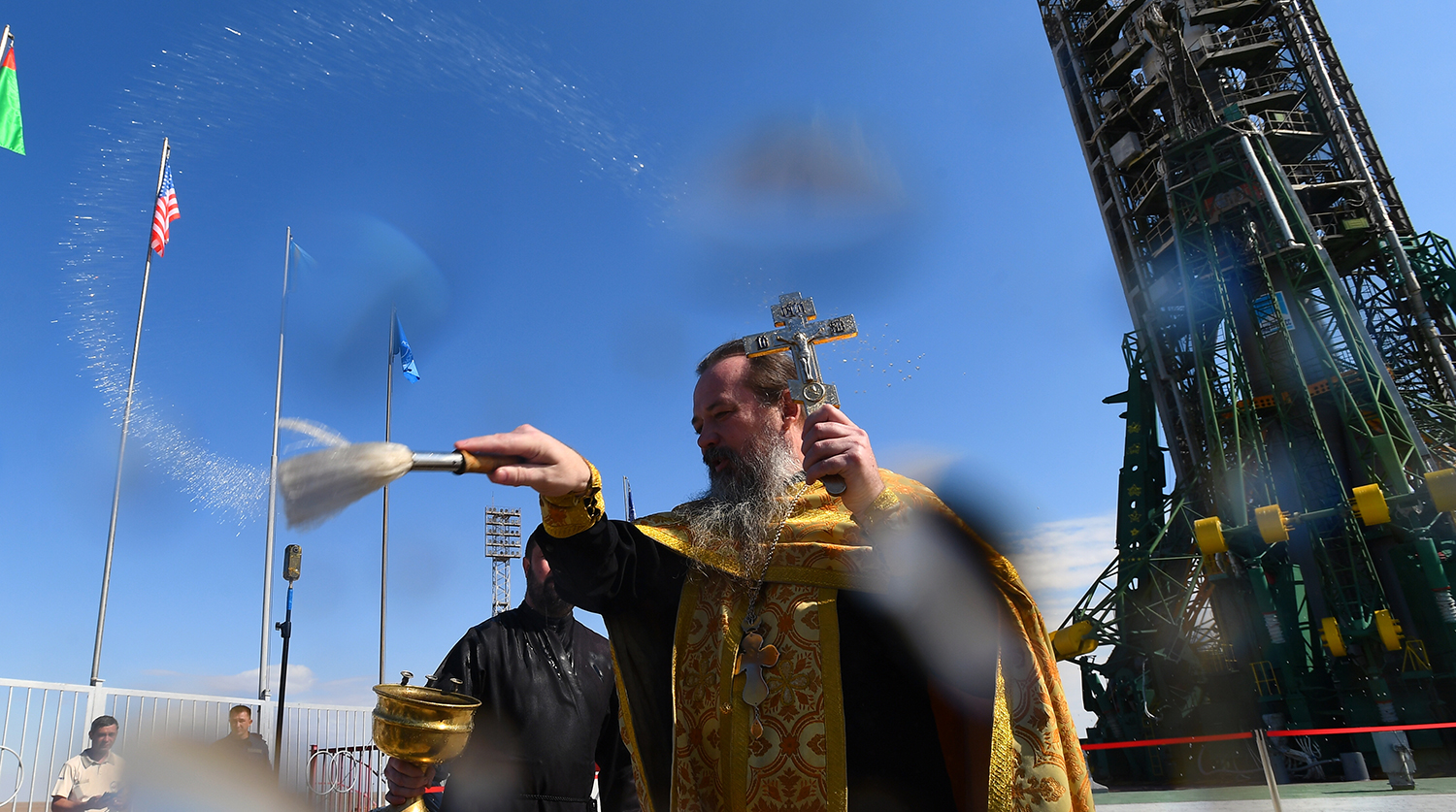 Духовник «Роскосмоса» отец Сергий (Сергей Бычков) во время обряда освящения ракеты-носителя «Союз-ФГ» с пилотируемым кораблем «Союз МС-15» на стартовой площадке космодрома Байконур, 24 сентября 2019 года