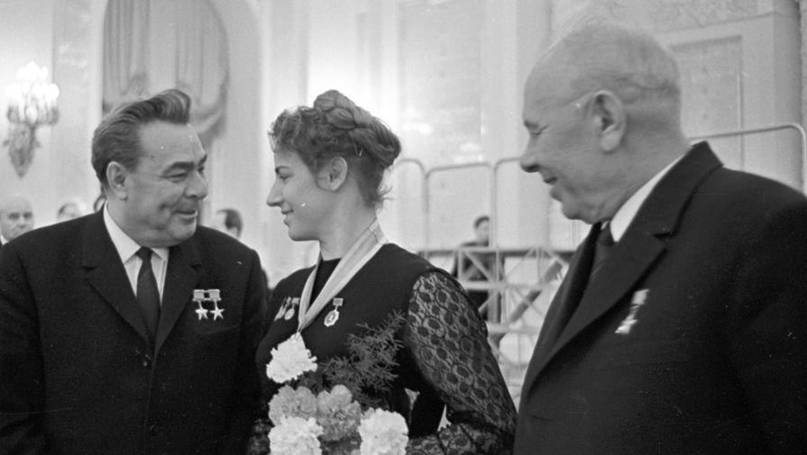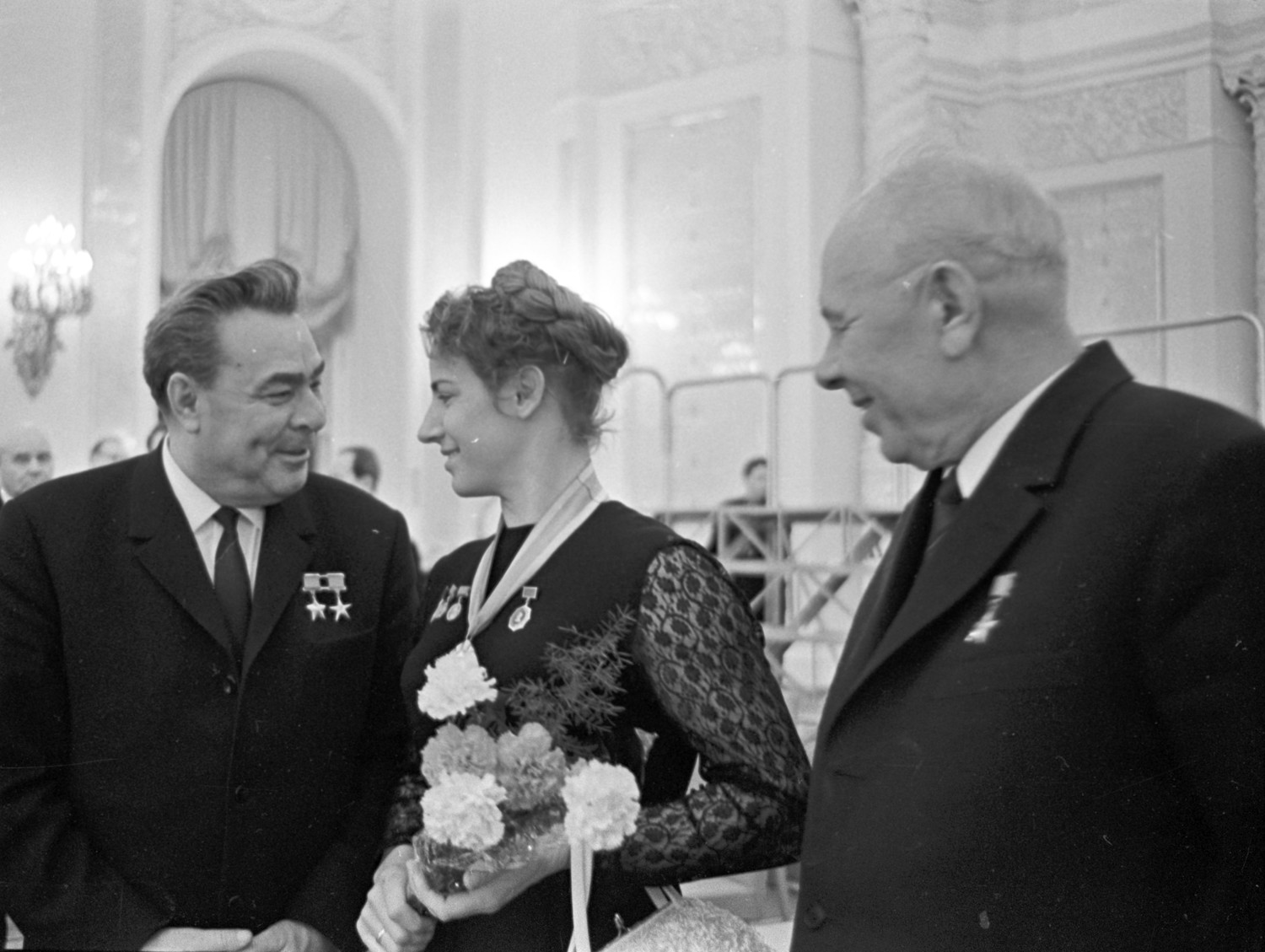 1969 год. II съезд колхозников в Кремлевском Дворце съездов. Генеральный секретарь ЦК КПСС Леонид Брежнев (слева) и Председатель Президиума Верховного Совета СССР Николай Подгорный беседуют с чемпионкой СССР по машинному доению Марите Шаулене из колхоза «Пергале» Литовской ССР.