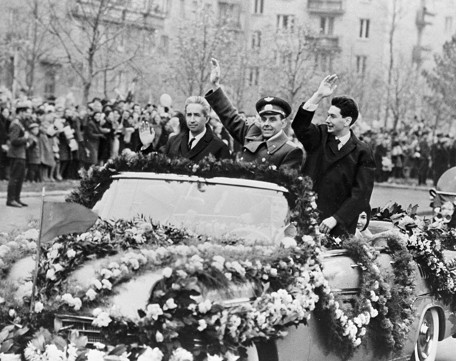 Жители Москвы встречают членов экипажа космического корабля «Восход» (слева направо) Константина Феоктистова, Владимира Комарова и Бориса Егорова, 1964 год