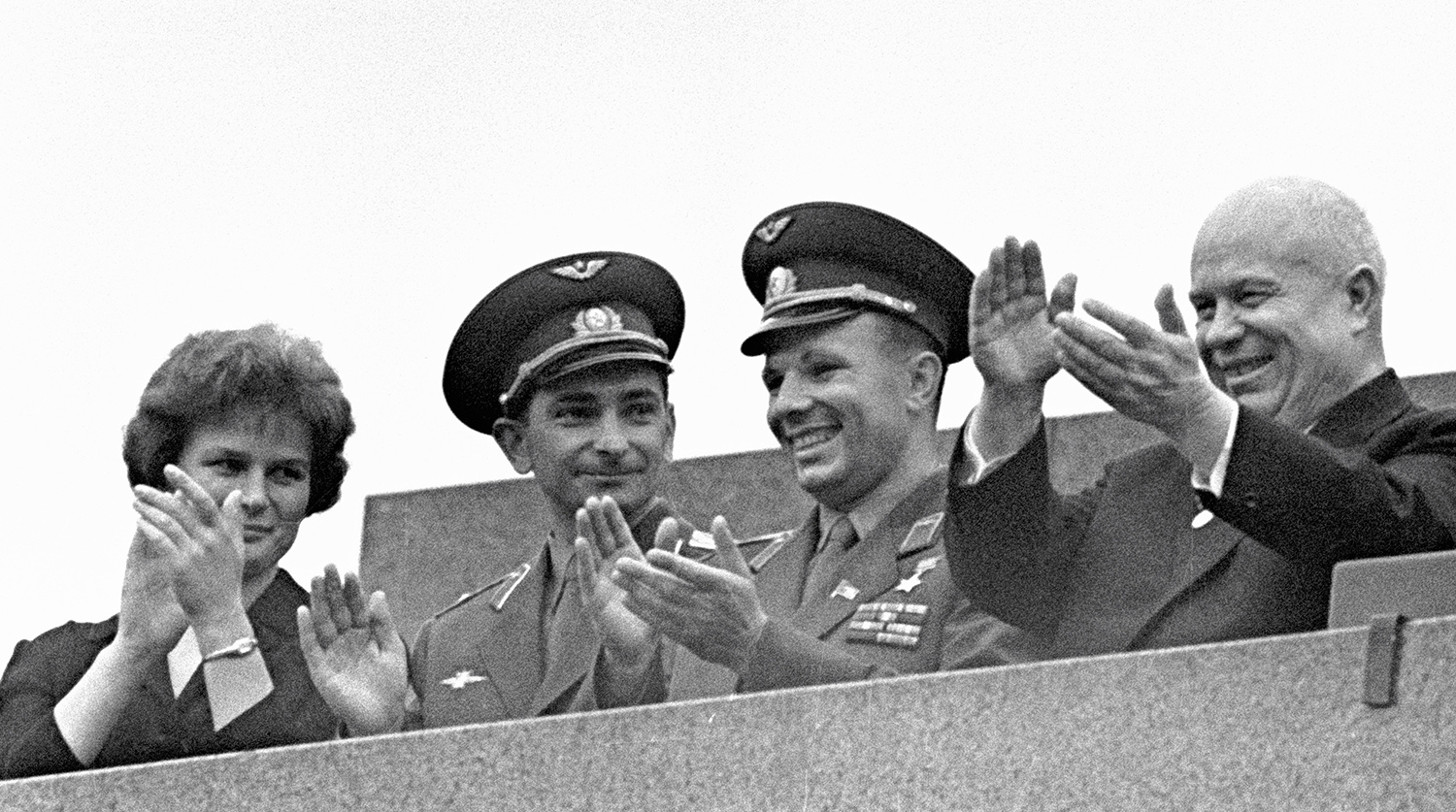 Первый секретарь ЦК КПСС Никита Сергеевич Хрущев и летчики-космонавты СССР: Юрий Гагарин, Валерий Быковский и Валентина Терешкова во время митинга на Красной площади в Москве, посвященного успешному завершению полета космических кораблей «Восток-5» и «Восток-6», 1963 год
