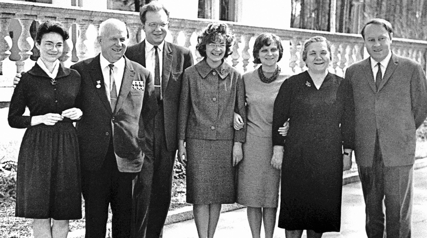 Семейное фото Никиты Сергеевича Хрущева. Первый секретарь ЦК КПСС, Председатель Совета Министров СССР Н.С. Хрущев (1894-1971) (слева направо): дочь Елена, сын Сергей, жена Сергея, дочь Рада, жена Нина Петровна. зять А.И.Аджубей, 1963 год