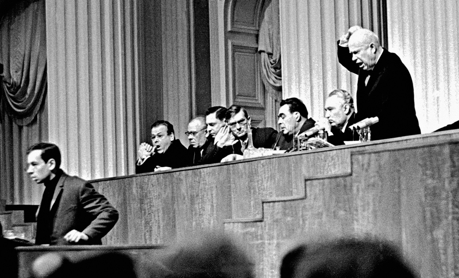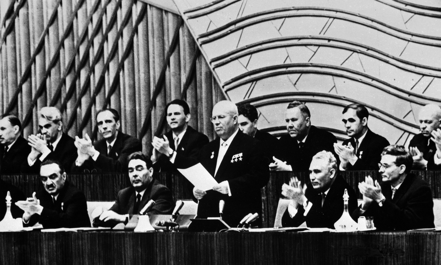 Первый секретарь ЦК КПСС Никита Хрущев (стоит), Председатель Президиума Верховного Совета СССР Леонид Брежнев (в первом ряду второй слева), заместитель Председателя Совета Министров СССР Анастас Микоян (в первом ряду первый слева), член Президиума ЦК КПСС Михаил Суслов (в первом ряду крайний справа) в президиуме XXII съезда КПСС.