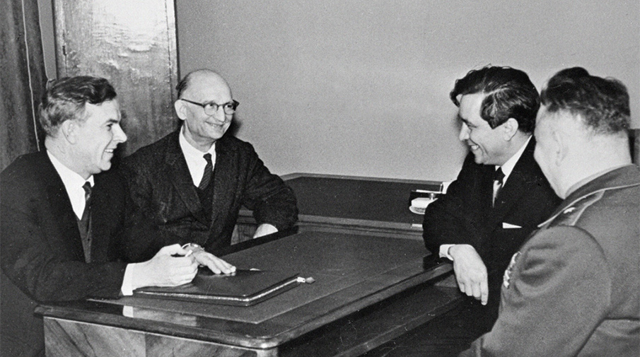 Председатель КГБ при Совете министров СССР В. Е. Семичастный (1-й слева) принимает советских разведчиков Р. Абеля (2-й слева) и К. Молодого (2-й справа), 1964 год
