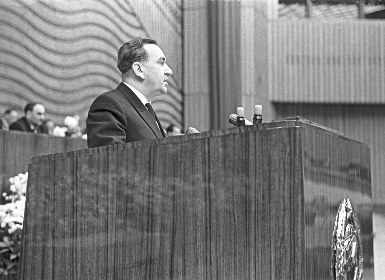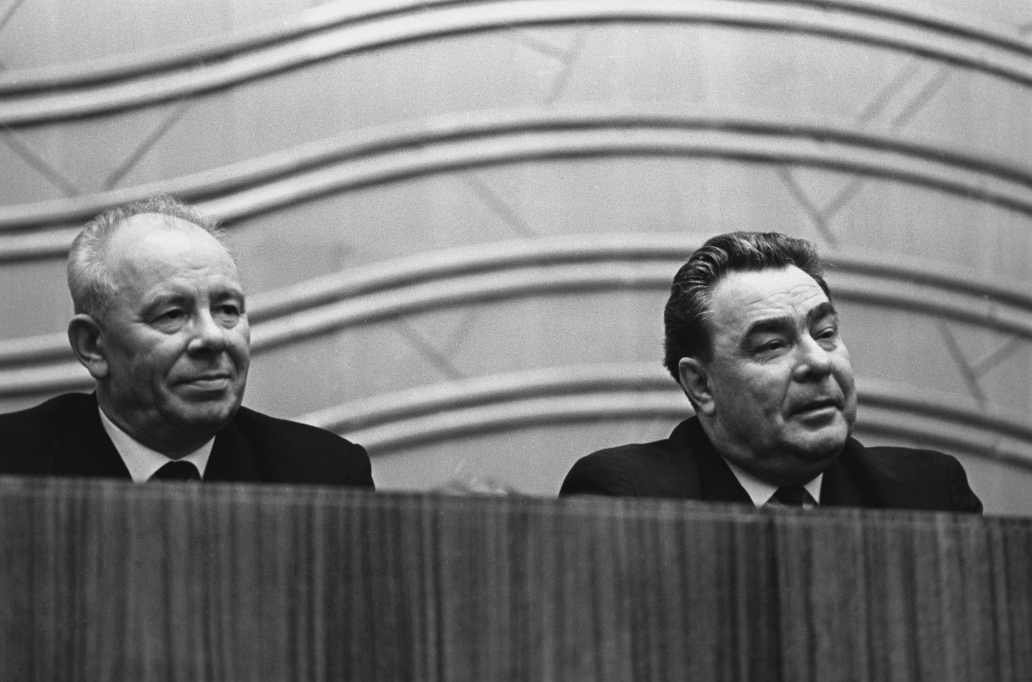 Председатель Президиума Верховного Совета СССР Николай Подгорный и генеральный секретарь ЦК КПСС Леонид Брежнев в президиуме торжественного пленума ЦК ВЛКСМ, посвященного 50-летию Ленинского комсомола.