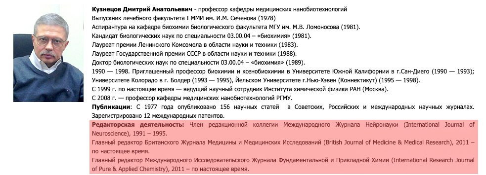 Интересно, что в то время, когда Лархаммар направил в редакцию журнала свое первое письмо, Дмитрий Кузнецов был членом его редколлегии — по крайней мере, об этом сообщается на сайте РНИМУ Пирогова, где Кузнецов числится профессором кафедры медицинским нанобиотехнологий. Там же сообщается, что Кузнецов — главный редактор журналов British Journal of Medicine & Medical Research и International Research Journal of Pure & Applied Chemistry, что не соответствует действительности.