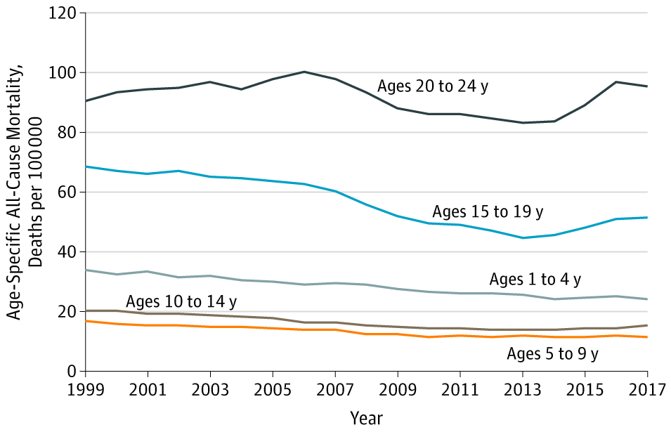 Для людей в возрасте от 25 до 34 лет смертность от связанных с алкоголем заболеваний увеличилась на 157,6% в период с 1999 по 2017 год. Показатели самоубийств увеличились на 38,3% для людей в возрасте от 25 до 64 лет и на 55,9% для людей в возрасте от 55 до 64 лет.