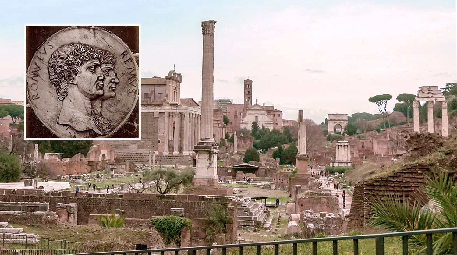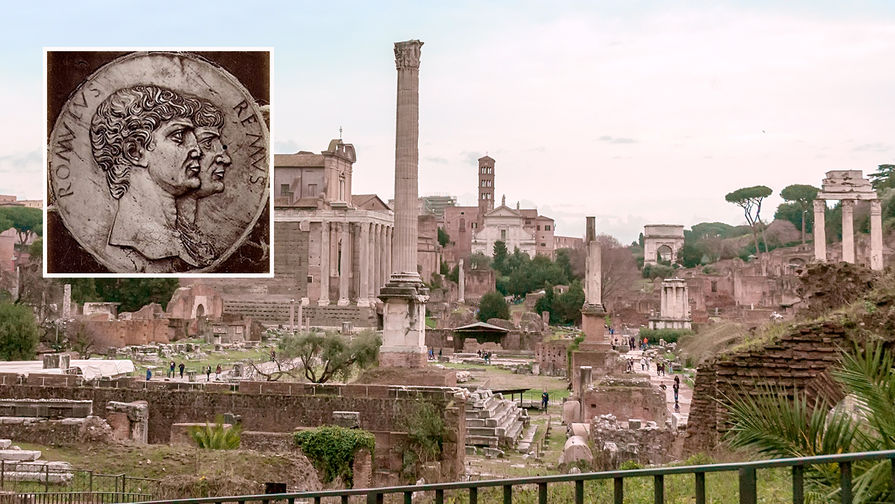 Корзину с младенцами прибило к берегу. Там их увидела волчица, которая вскормила мальчиков своим молоком. Повзрослев, близнецы решили основать поселение на Тибре, но никак не могли выбрать точное место. Рем выбирал между Авентином и Капитолием холмами, а Ромул настаивал на Палатинском холме. Братья сели спиной друг к другу и стали ждать знаков свыше. Рем увидел шесть парящих в небе коршунов, а Ромул — двенадцать. Победа была на стороне Ромула.